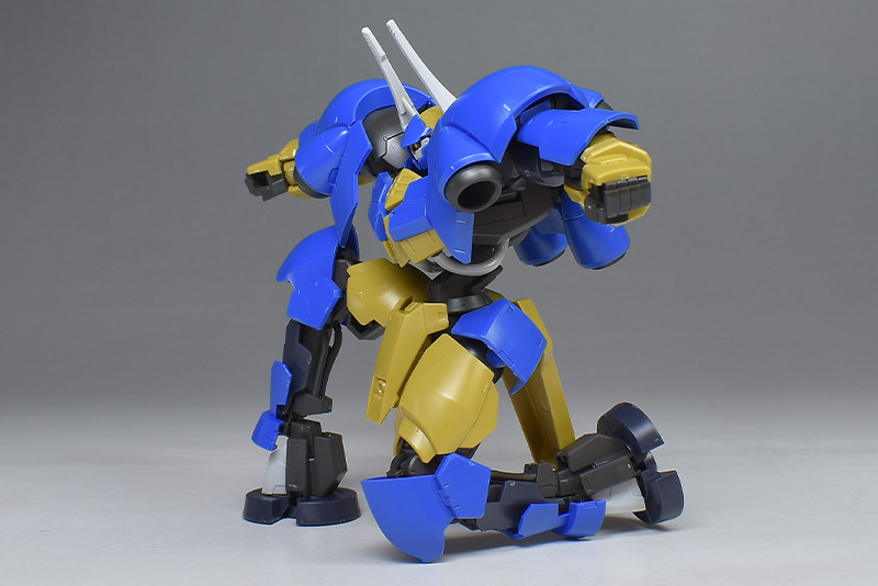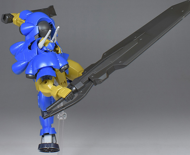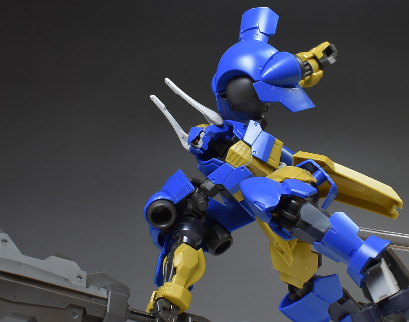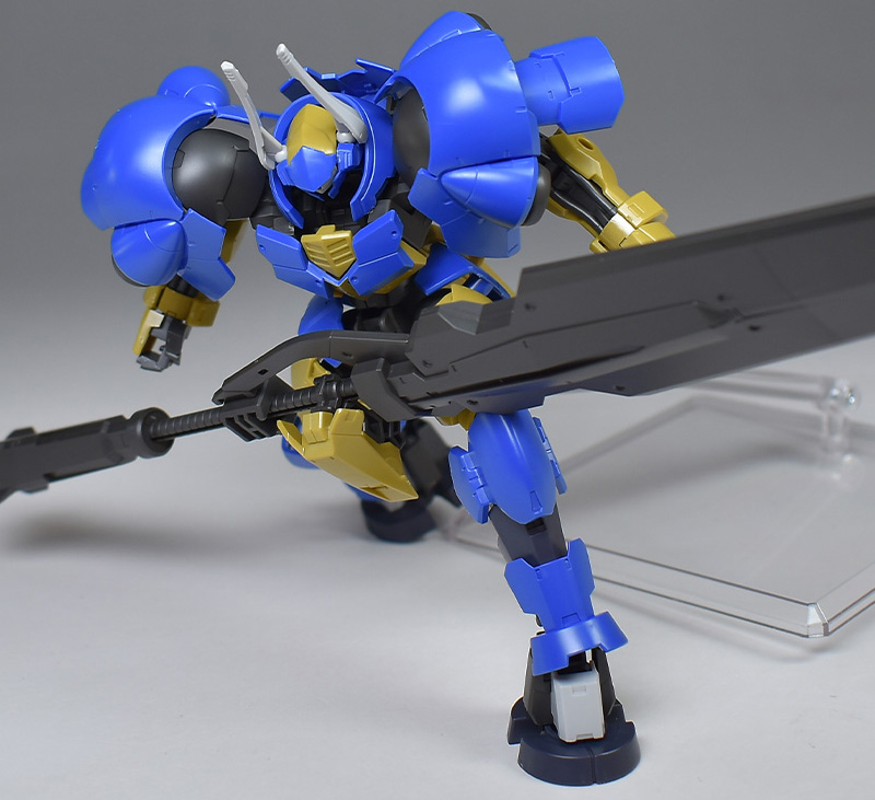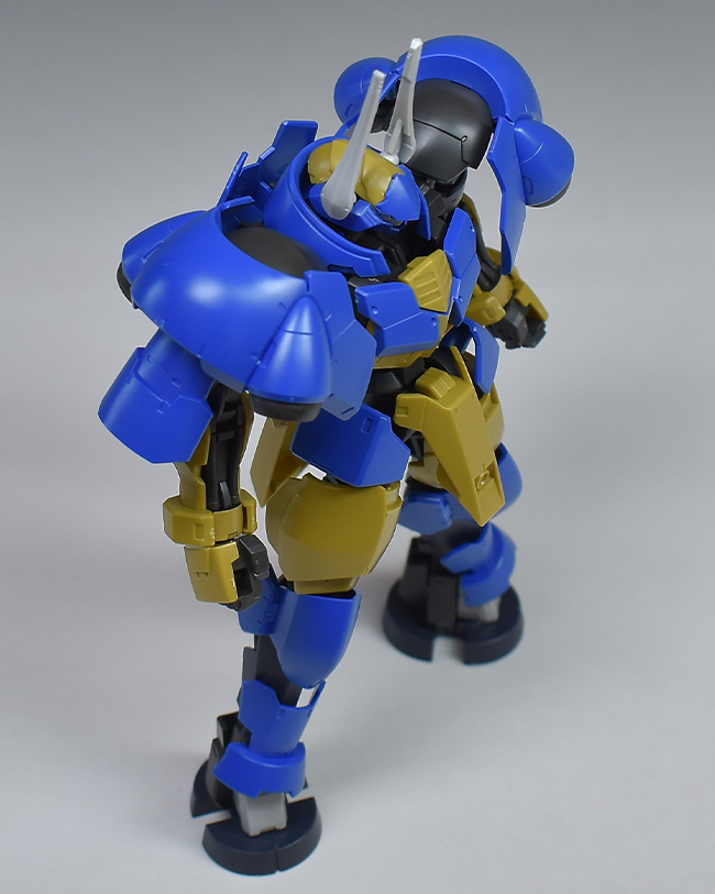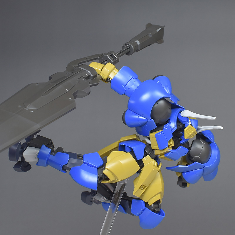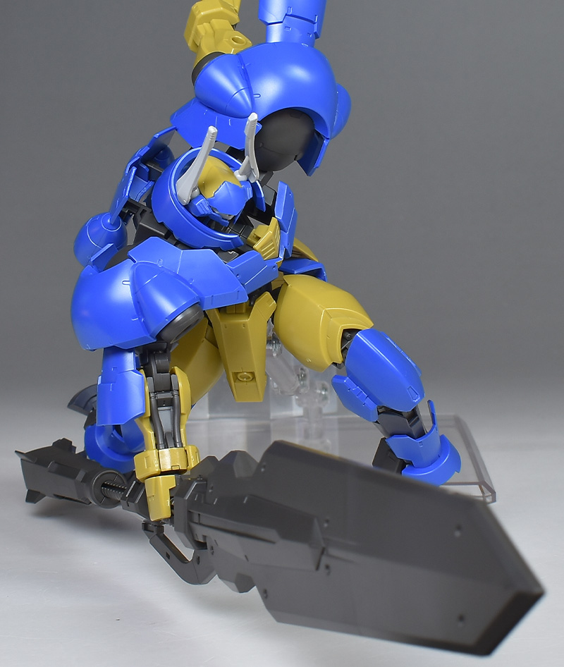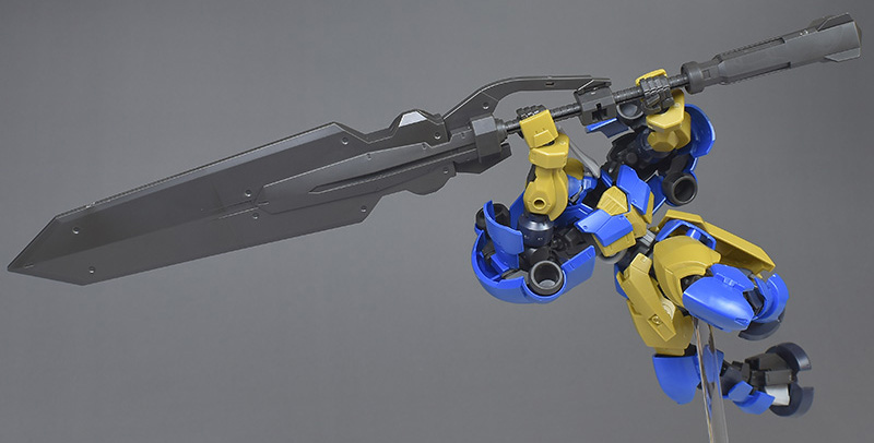 成形色はブルーとダークイエローを基調に、頭部アンテナや腹部動力パイプ、脚甲などにライトグレーを配色。その他、内部や関節、ヴァルキュリアバスターソードなどはダークグレー成形色での再現となっています。