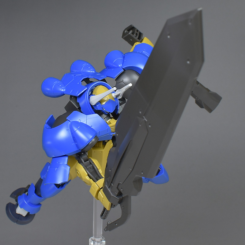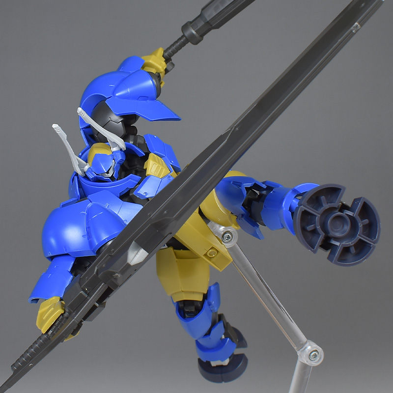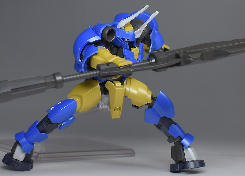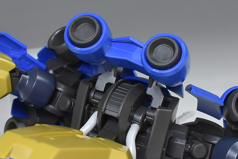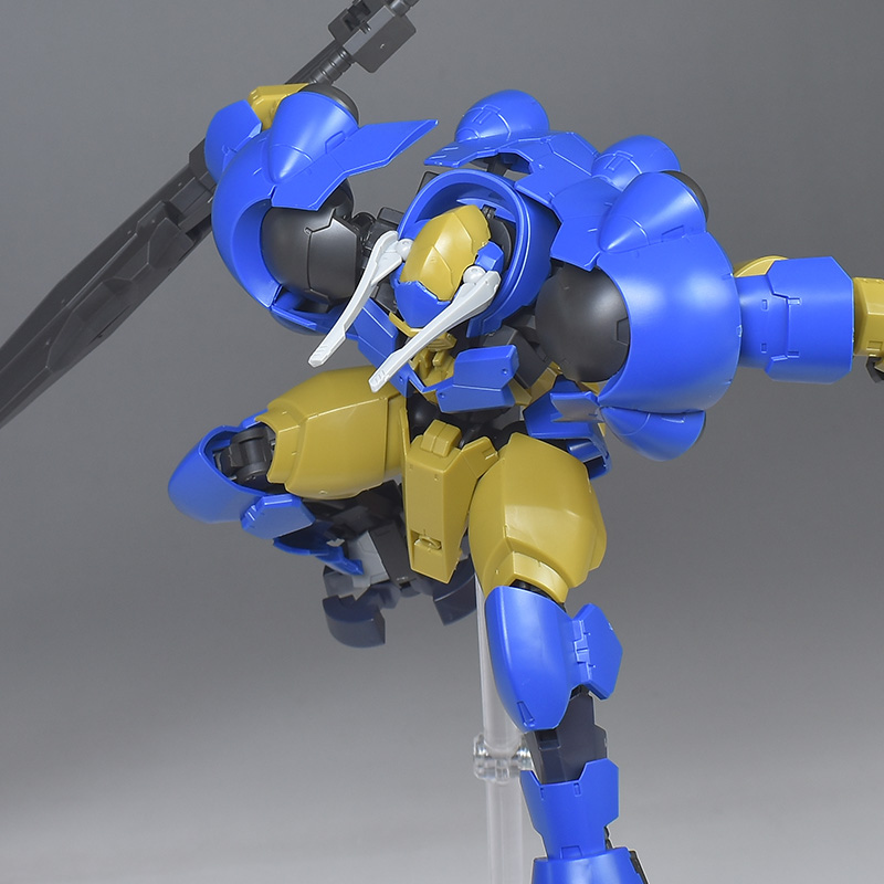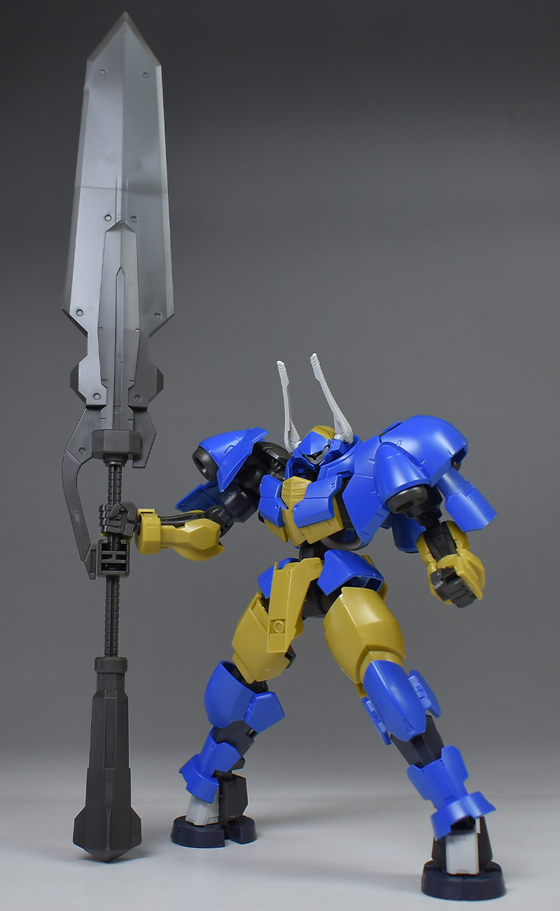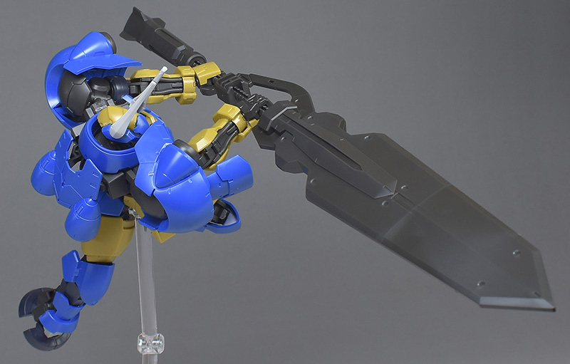 成形色はブルーとダークイエローを基調に、頭部アンテナや腹部動力パイプ、脚甲などにライトグレーを配色。その他、内部や関節、ヴァルキュリアバスターソードなどはダークグレー成形色での再現となっています。
