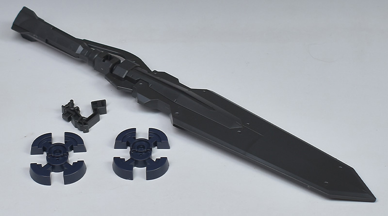 ヴァルキュリアバスターソード、ヴァルキュリアバスターソード用ジョイントパーツ、展開状態のソール部パーツ✕2が付属。