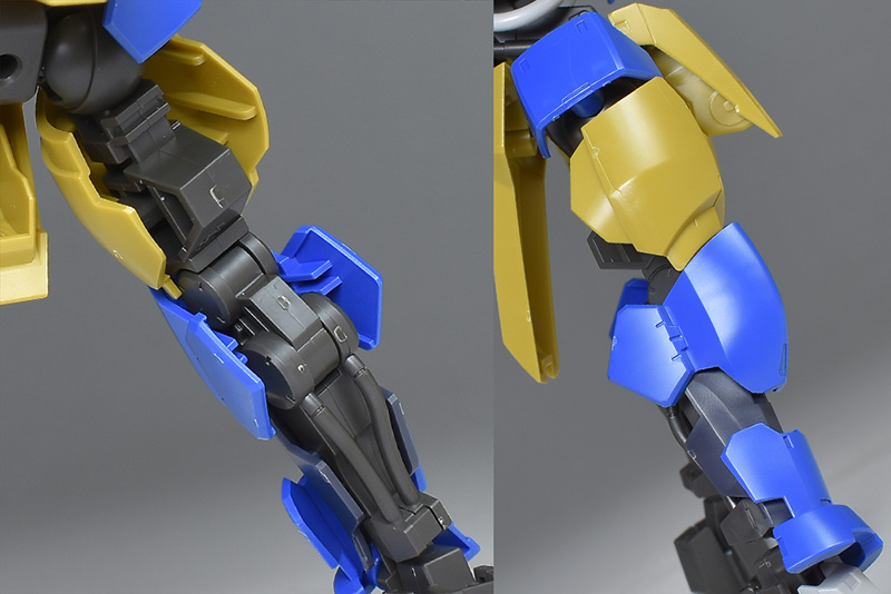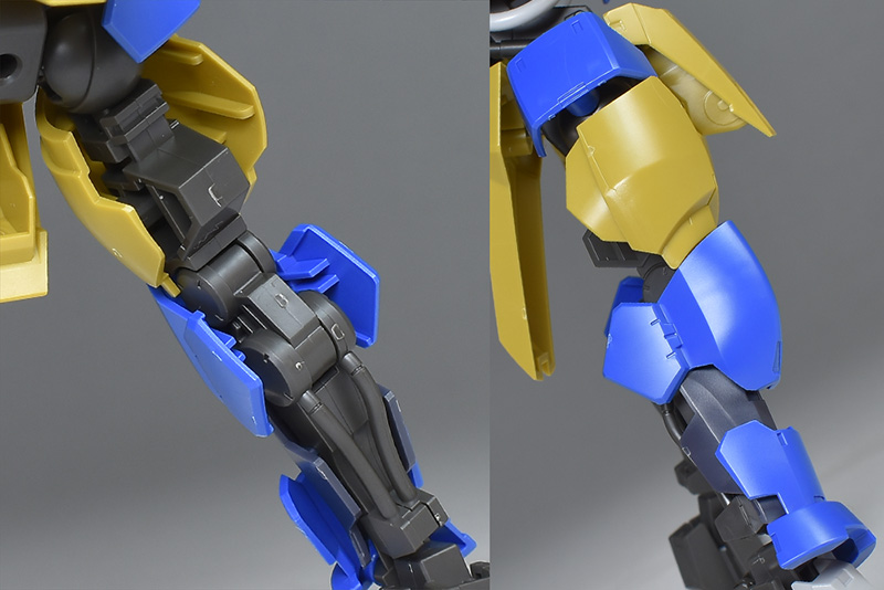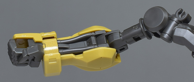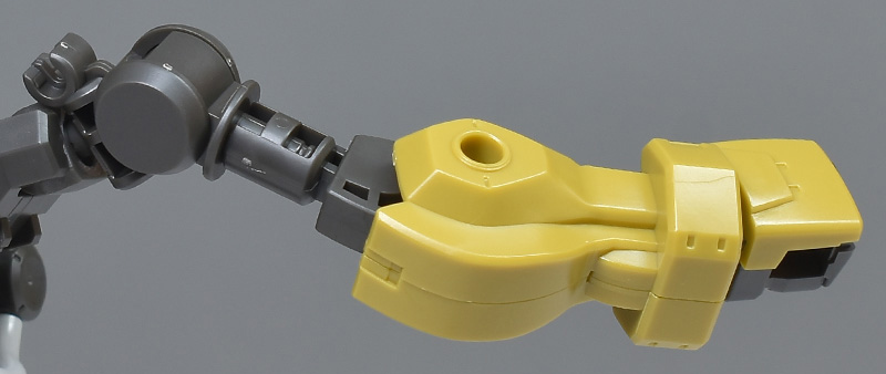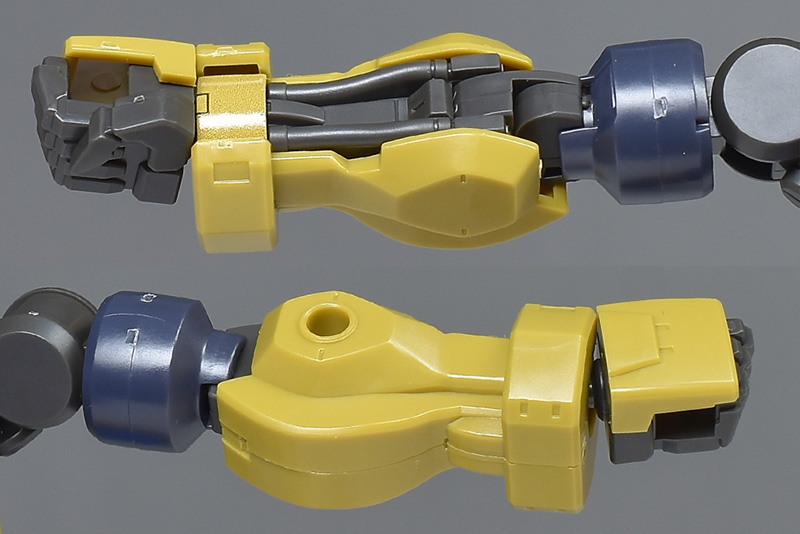 上腕は筒型で合わせ目はなし。前腕は左右の組み合わせで後部中央に合わせ目ができます。肘から分離しないので、合わせ目を消す場合は後ハメなどの加工が必要。前面の動力パイプは白く塗り分けが必要です。手首の黄色い装甲はシールでの色分け。