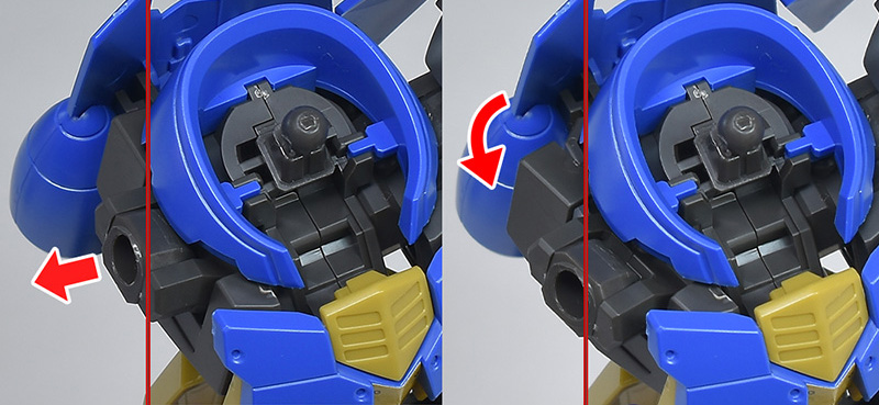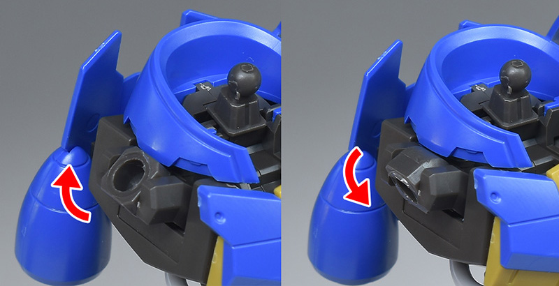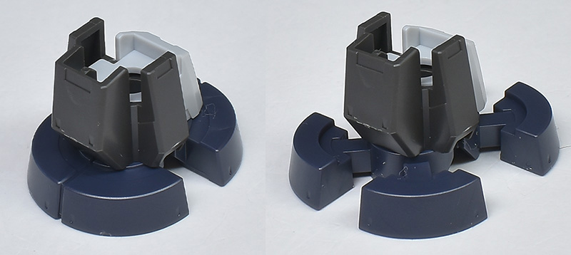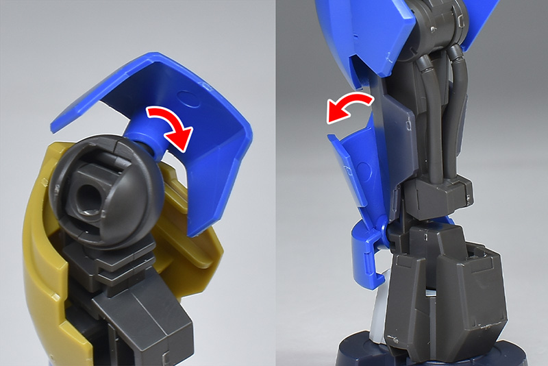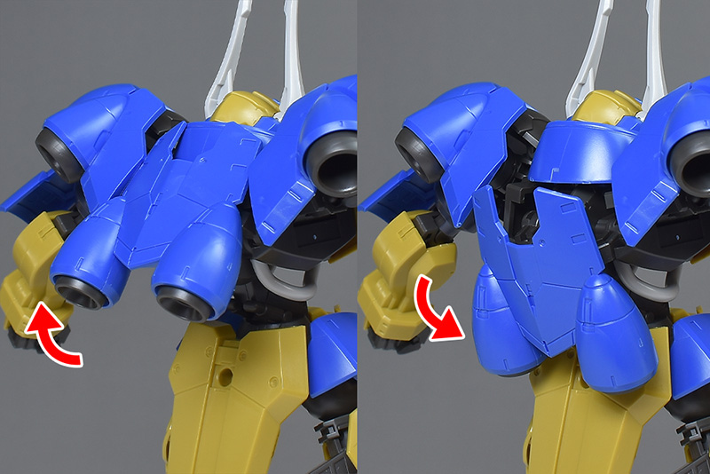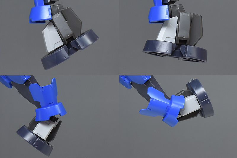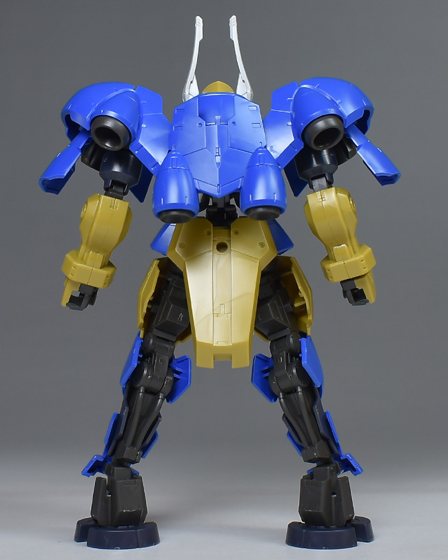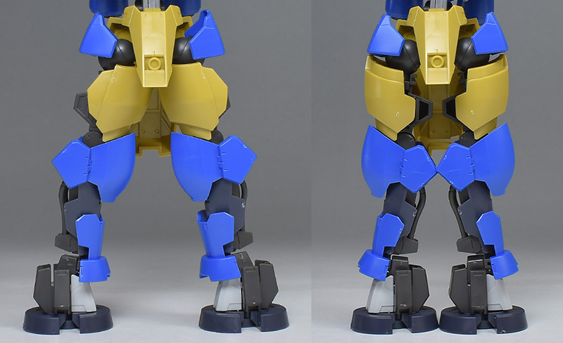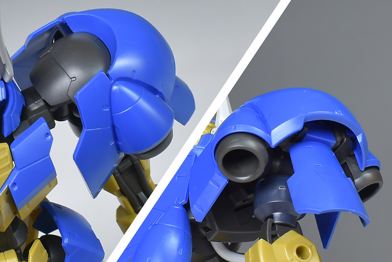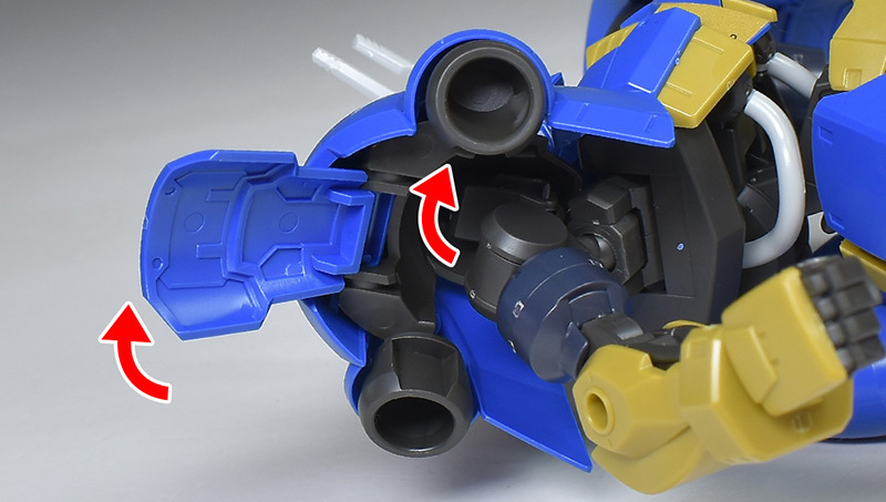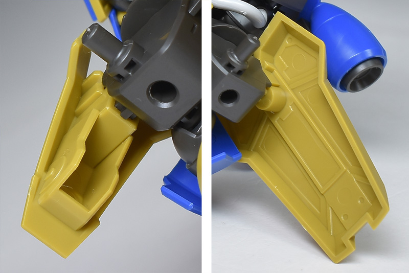 青い装甲は簡単な前後の組み合わせで合わせ目ができます。消す場合は内部に挟むスラスター口パーツの後ハメが必要。スラスター口は開口こそされていませんが、モールドや色分けでHGとしては十分な造り。
