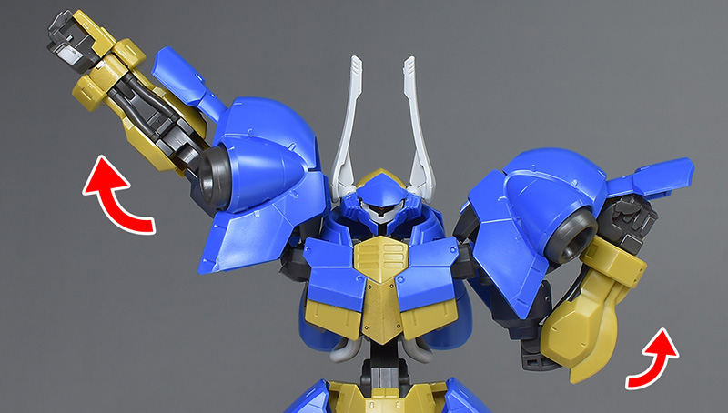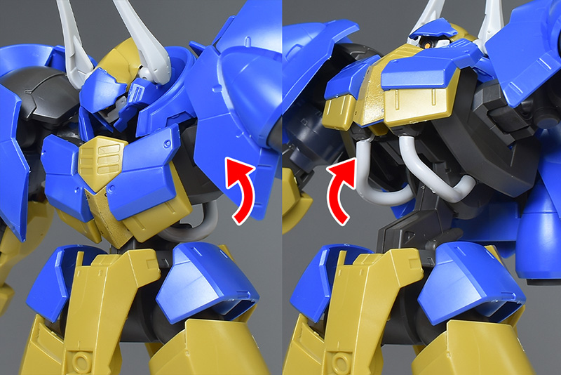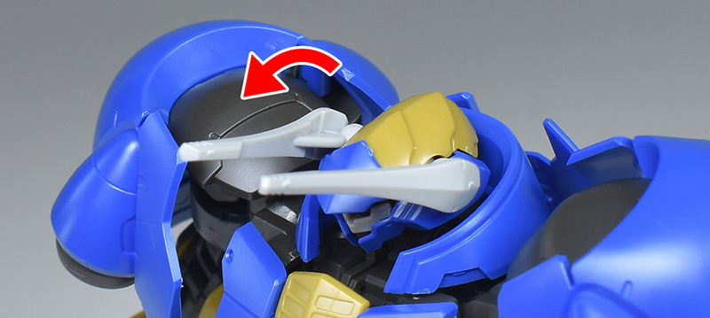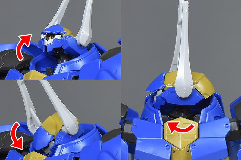 胸部装甲を頭部に組み付けてフェイスガードに。角を前方に展開することで、闘牛が敵機に突っ込むような独特の攻撃ポーズを再現することができます。