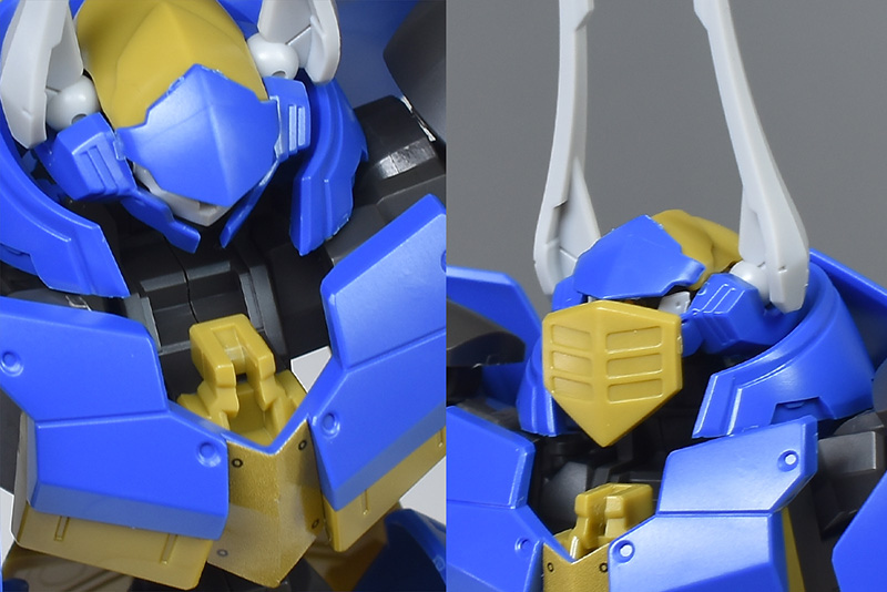 胸部装甲は取り外すことで頭部に組み付け可能。フェイスガードとして使用することができます。表面のスリットモールドはグレーに塗り分けが必要。