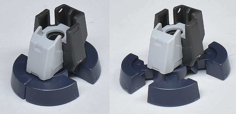ソール部。牛の蹄のような円形装甲が特徴的に造形されています。脚底は付属のパーツと組み替えることで展開状態が再現可能。脚甲と内部のジョイントパーツは左右で形状や向きが違っているため、組み間違えないように注意します。