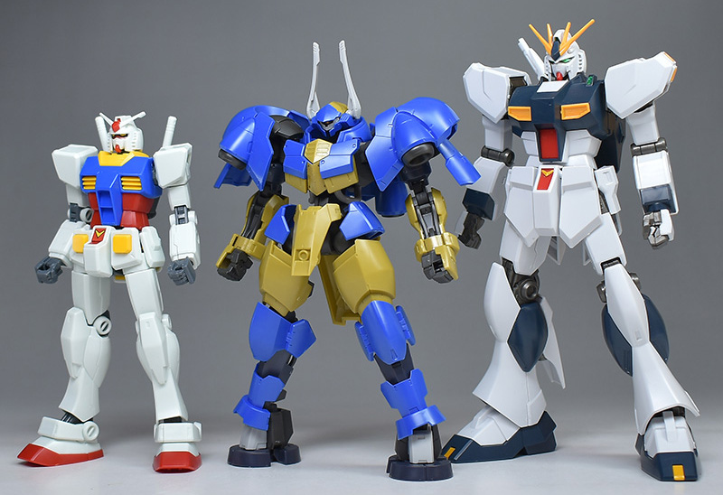 HGUC RX-78-2ガンダム(リバイブ版)、HGUCνガンダム(ファンネルなし)と並べて大きさを確認。頭頂高自体はRX-78-2とさほど差が無いですが、角のようなアンテナや肩部装甲によってボリューム感が増しています。ヘルムヴィーゲ・リンカーの全高は21.1m。