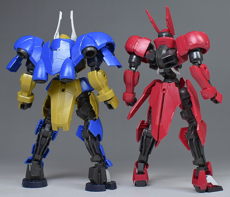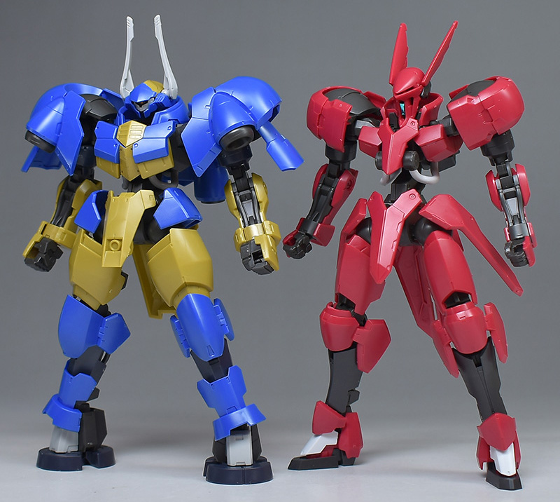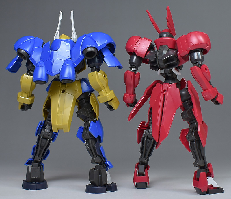 同じヴァルキュリア・フレームであるHGグリムゲルデと並べて比較。前腕や脚部後部など、フレームが露出する部分は形状が近いですが、外装が全く別物なので原型機とは思えないくらい、別機体のような容姿になっています。