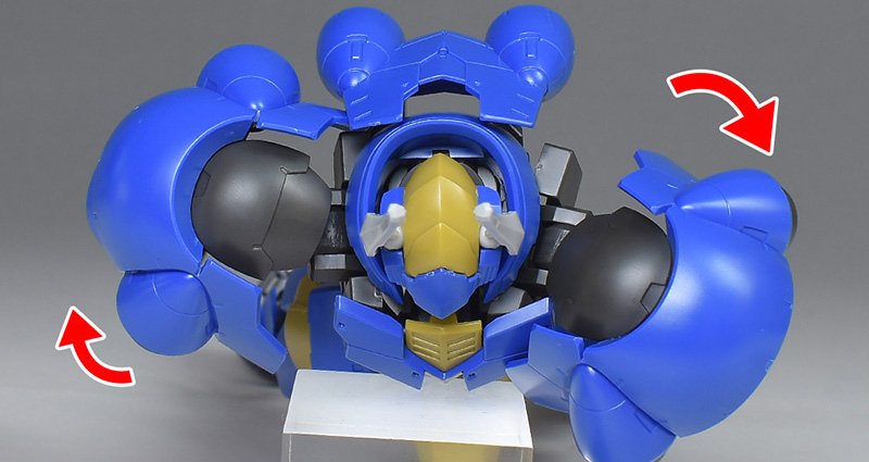 フロントアーマーが軽装なため、前方への開脚は幅広く展開します。後方はリアアーマーがやや干渉するので少し可動が制限されますが、それでも広めに展開します。