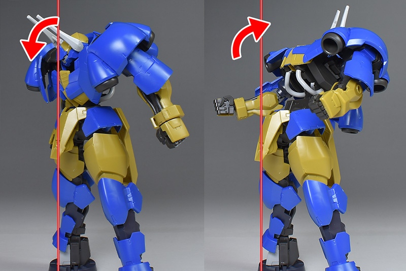 ヴァルキュリア・フレームの胸部可動ギミックにより、上半身を広く前後させることができます。