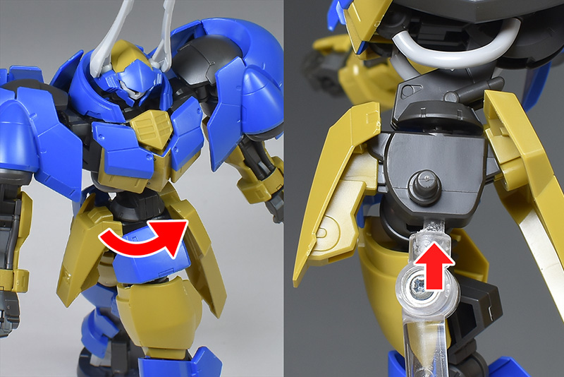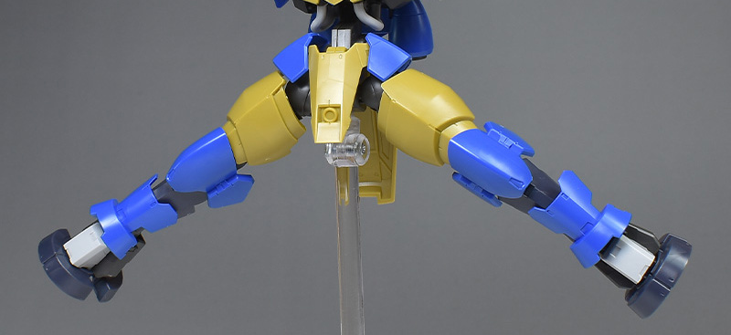 腰は干渉なく360度回転可能。浮かせてディスプレイさせる場合は、一般的なHGと同じく、股間部にアクションベースやスタンドの3.0mm軸を差し込みます。