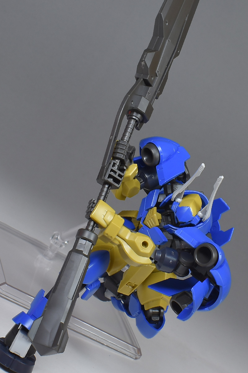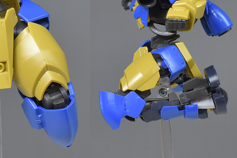 ポリキャップはHG鉄血のオルフェンズシリーズ定番のPC-002を使用しますが、肩部や足の付根に組み込むぐらいで少なめ。肘や膝関節はKPS素材で関節強度はまずまず高めです。容姿がトップヘビーですが特に負荷のかかるような装備もないため、自立は安定しています。