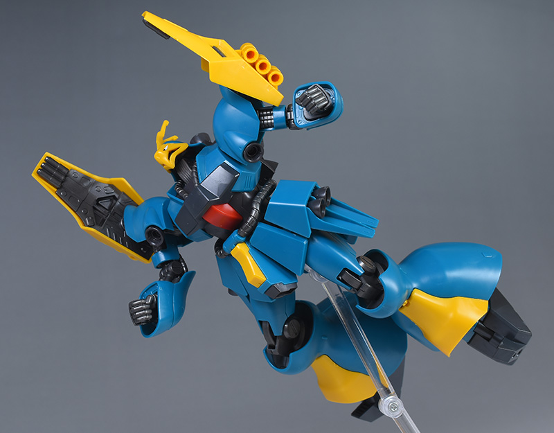 成型色は特徴的なブルーグリーンをベースに、各部にゴールド(イエロー)を配色。その他腹部にはレッド、内部、関節パーツにはメタリック調のダークグレー成型色パーツが使用されています。