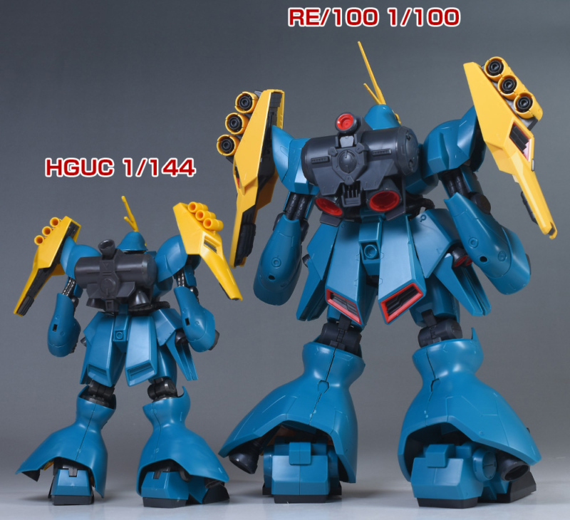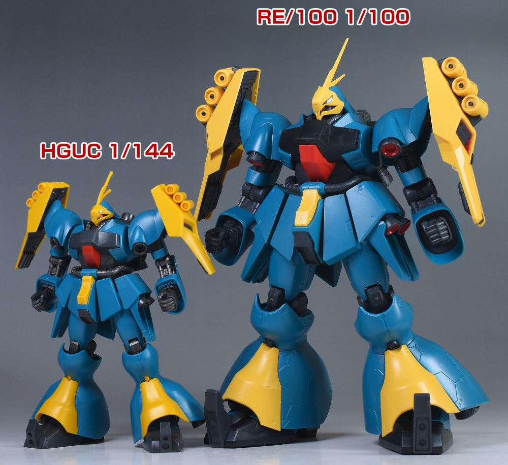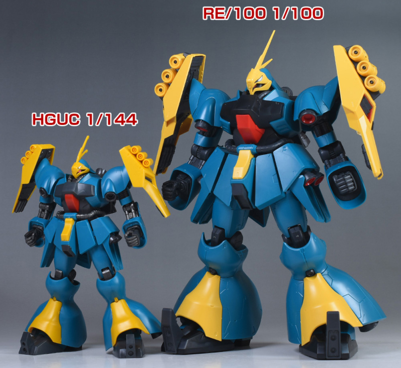 RE/100 ヤクト・ドーガ(ギュネイ・ガス機)と並べて。RE/100 ヤクト・ドーガはかなり巨大。1/144と1/100なのでキットの大きさにはかなり差があります。HGUCは小型なので取り扱いがラク。細部の色分けやモールドの緻密さはRE/100のほうが上ですが、プロポーションはHGUCのほうが少しスタイリッシュでバランスが良いかと。