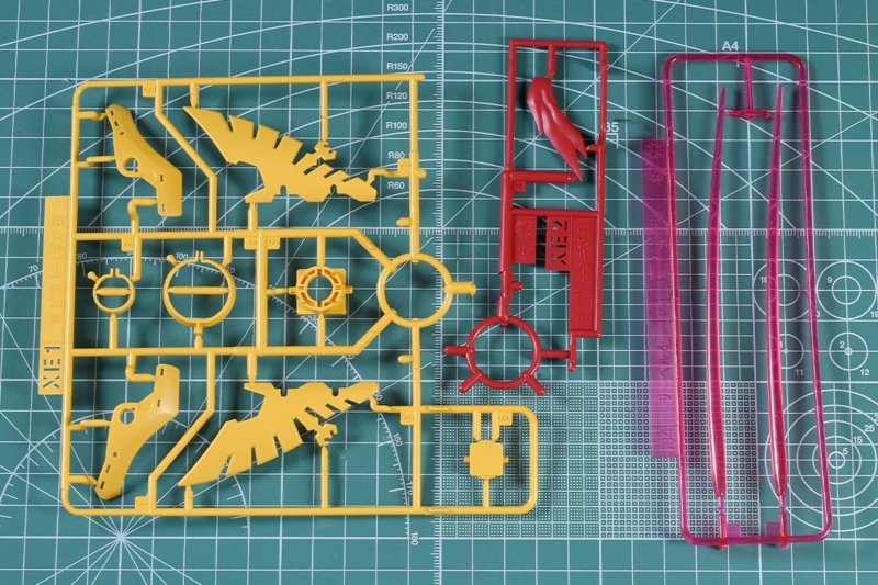 ↑XE1、XE2、SB4ランナー。XE1はイエロー成形色で、ヒートランス(テンペスト装備)、ヒートハルバード、背部ウイングバインダーパーツ。XE2ランナー。レッド成形色で、頭部の鳥冠パーツ。SB4はクリアピンク成形色のビーム・サーベル刃パーツです。