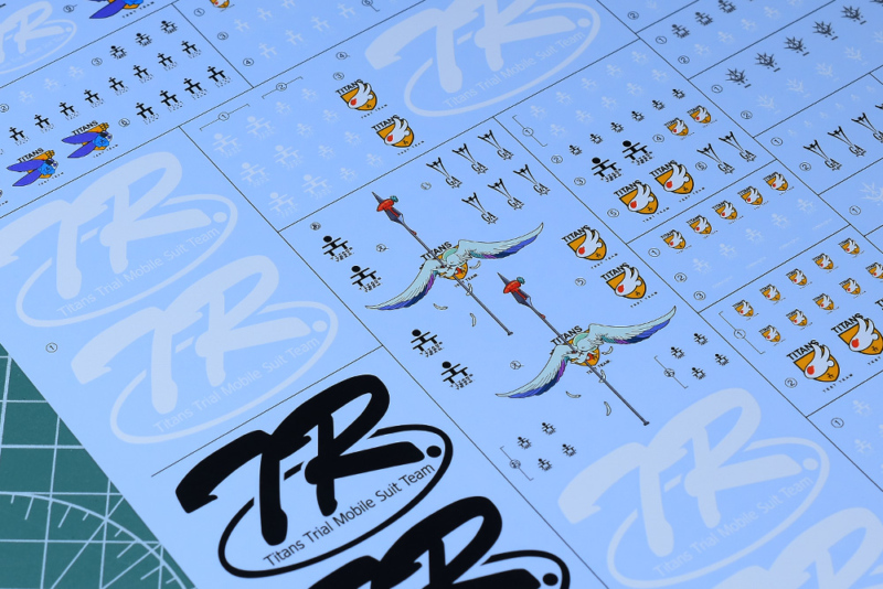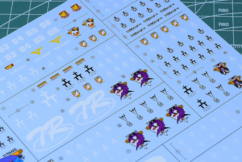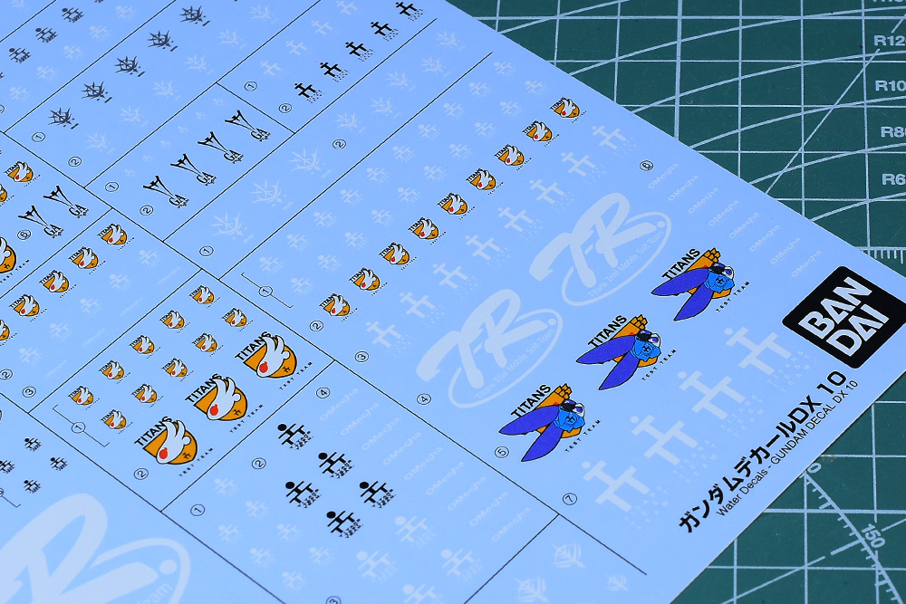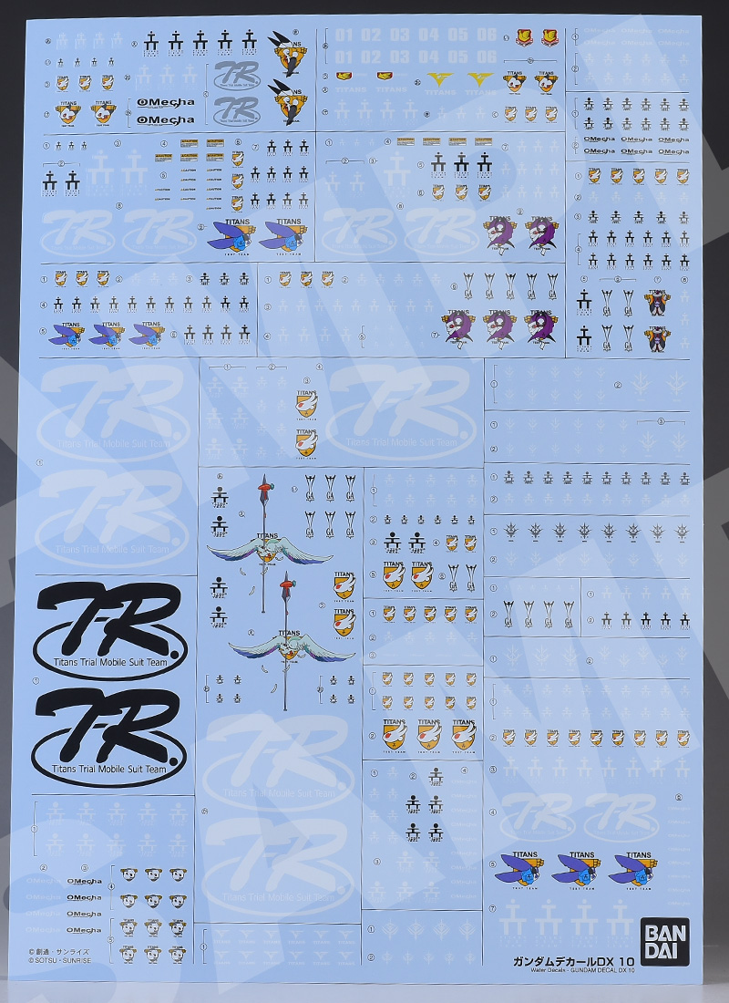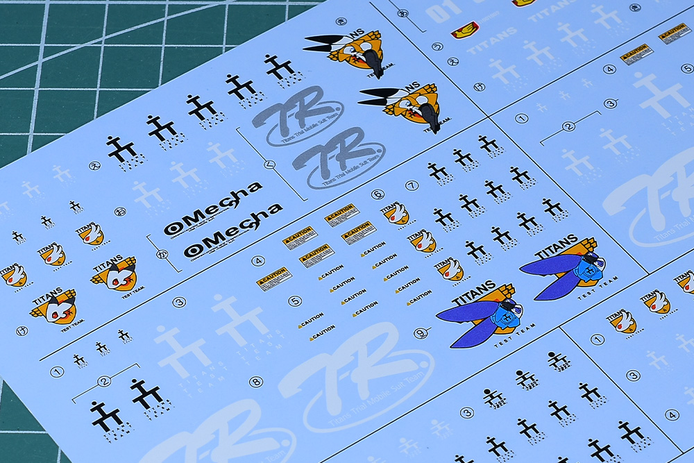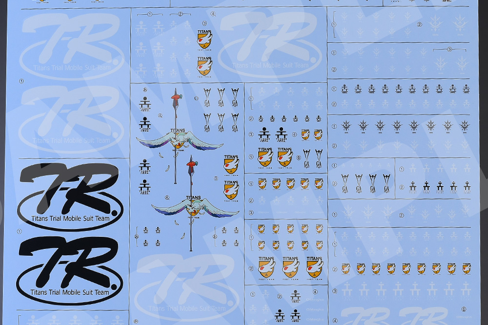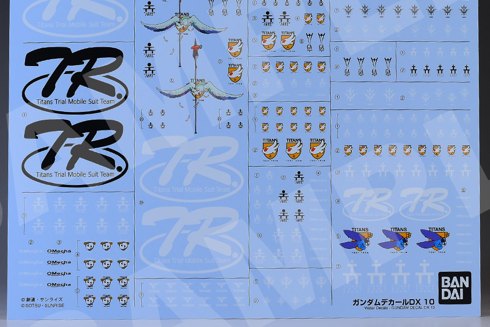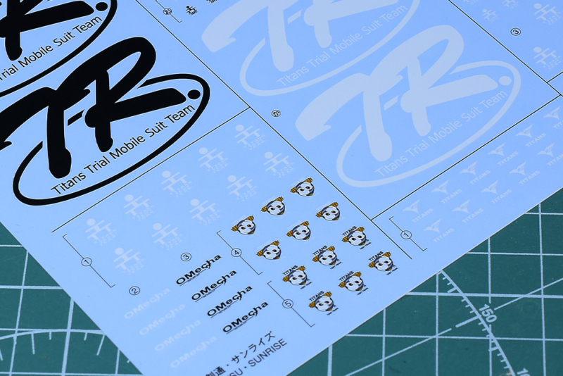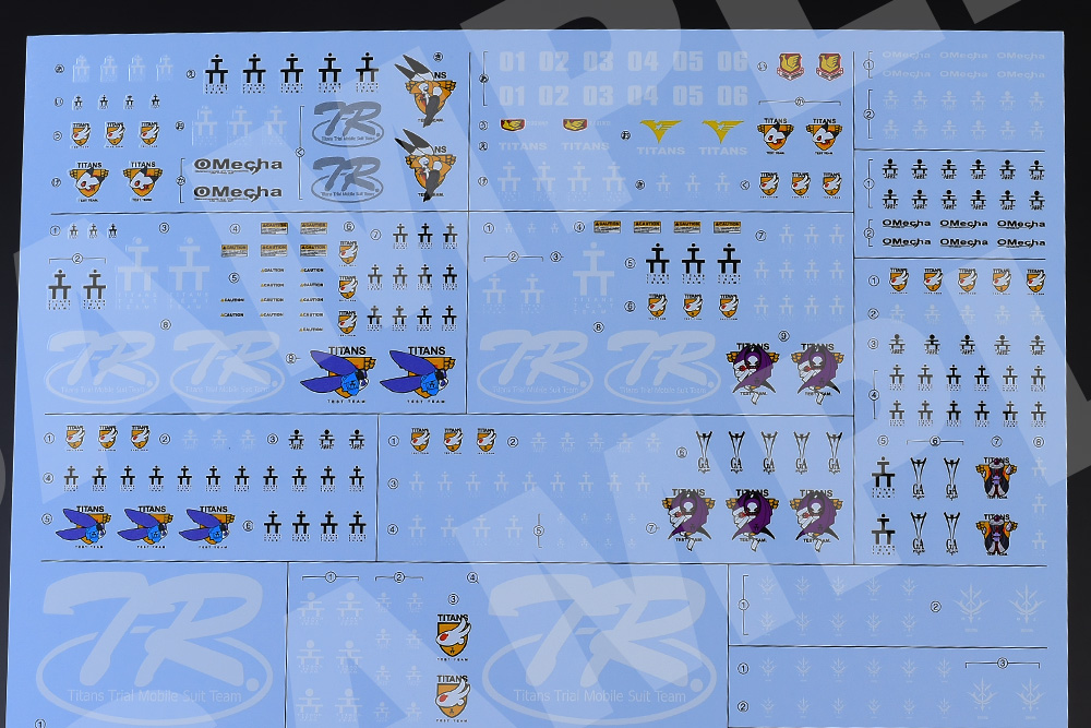 基本的にはT3(ティターンズテストチーム)マーク、Oメカ、TRシリーズのマークですが、機体用のエンブレムが複数収録されているのは嬉しいところです。ブラックオター(マーフィー小隊)用も収録されていますね。ちなみにOメカ:OMECHAはコンペイトウ技術本部のプロダクツマークになります。