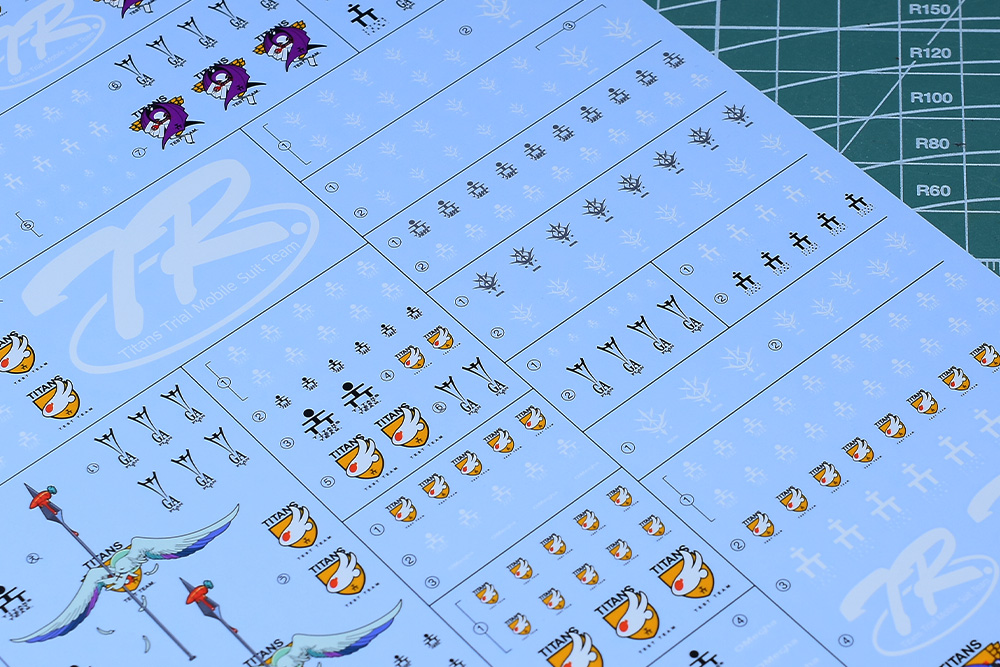 まずはデカール全体から。第1弾は基本的に1/144や1/100といったサイズ指定はなく、様々なキットに対応するデカールになっていました。なので専用のエンブレムなども大小が収録されていましたが、今回の第2弾は1/144サイズ対応となります。