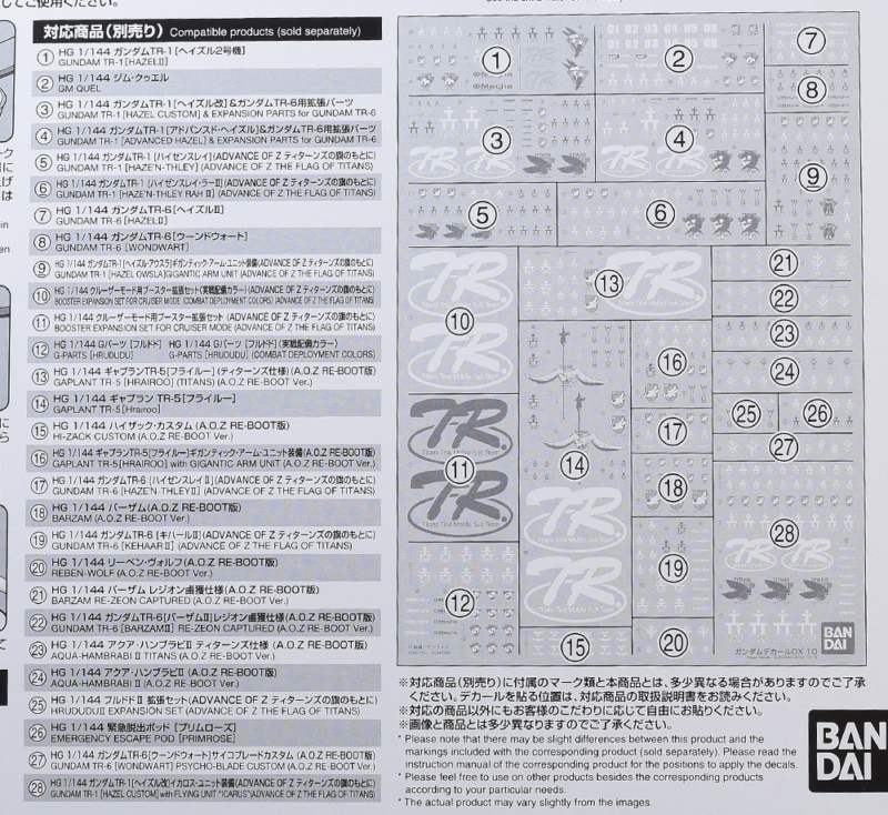 1/144 A.O.Zシリーズはヘイズル改を始め、ハイゼンスレイやフルドド、最近ではイカロス・ユニット装備など、これまでに一般やプレバンで多くのキットが発売されてきましたが、専用のデカールはガンダムデカールNo.35くらいだったので待ちわびていた方には特に嬉しいアイテムですね。