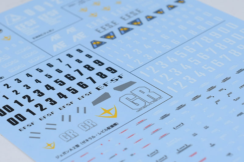 続いて中段。こちらはジェガンA2型のゼネラル・レビル配備機とナンバーデカールです。特徴的なショルダーアーマーのモールドやフレキシブルスラスター側面のモールドを補うデカールも収録されています。
