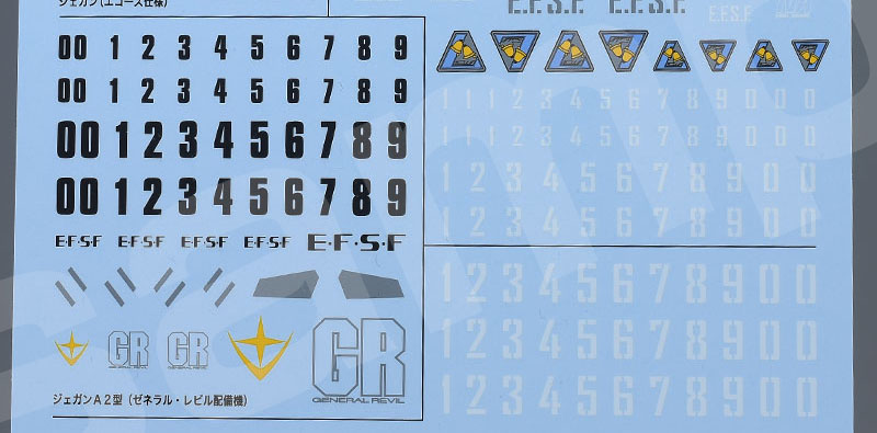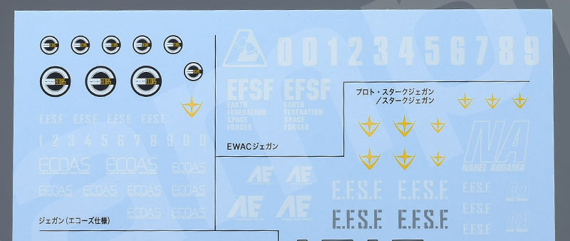 下段はジェガン各種共通のマーキングが収録されている他、D型やプロト・スタークジェガン、A2型、EWACの形式番号も収録されていて幅広く使えるようになっています。
