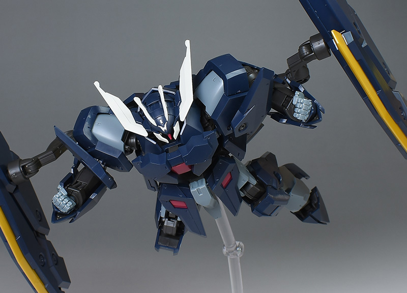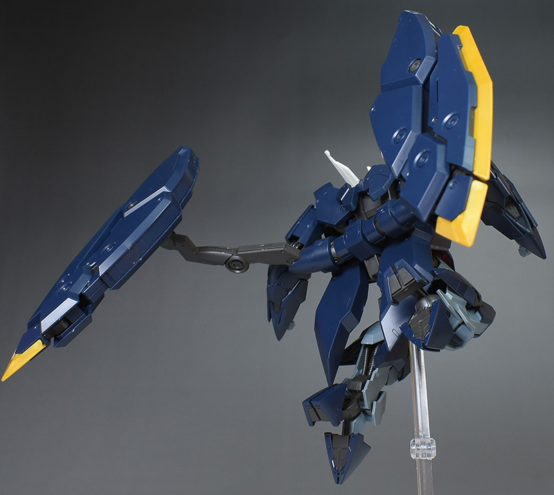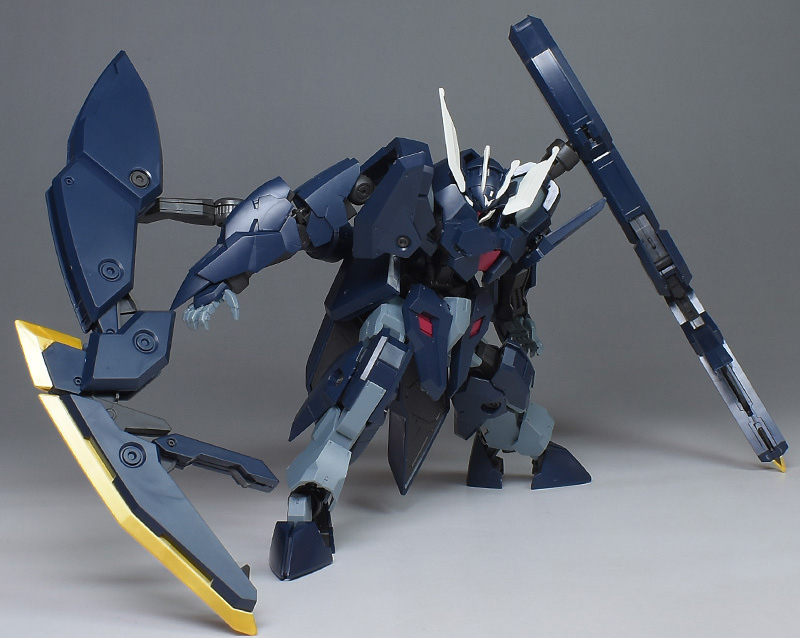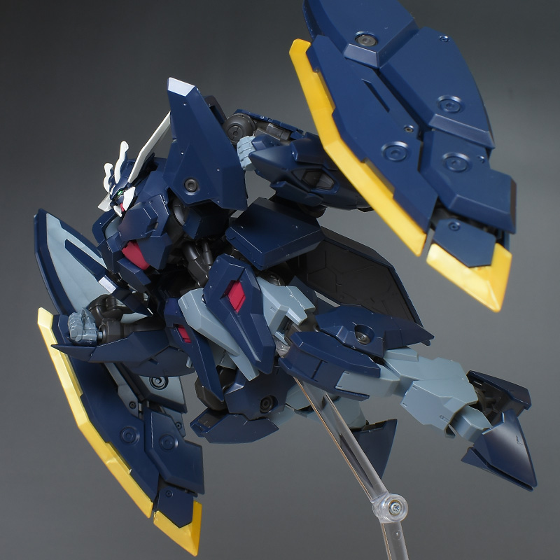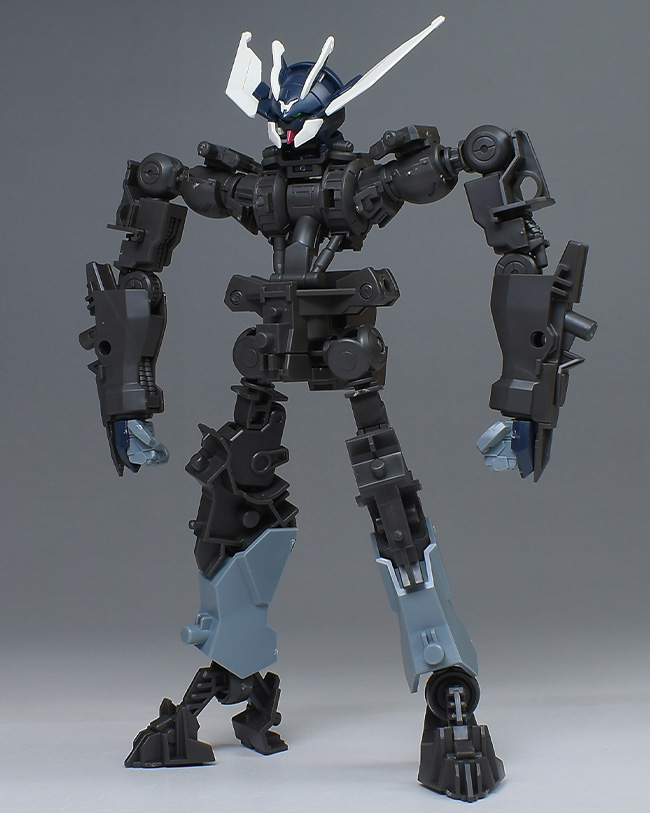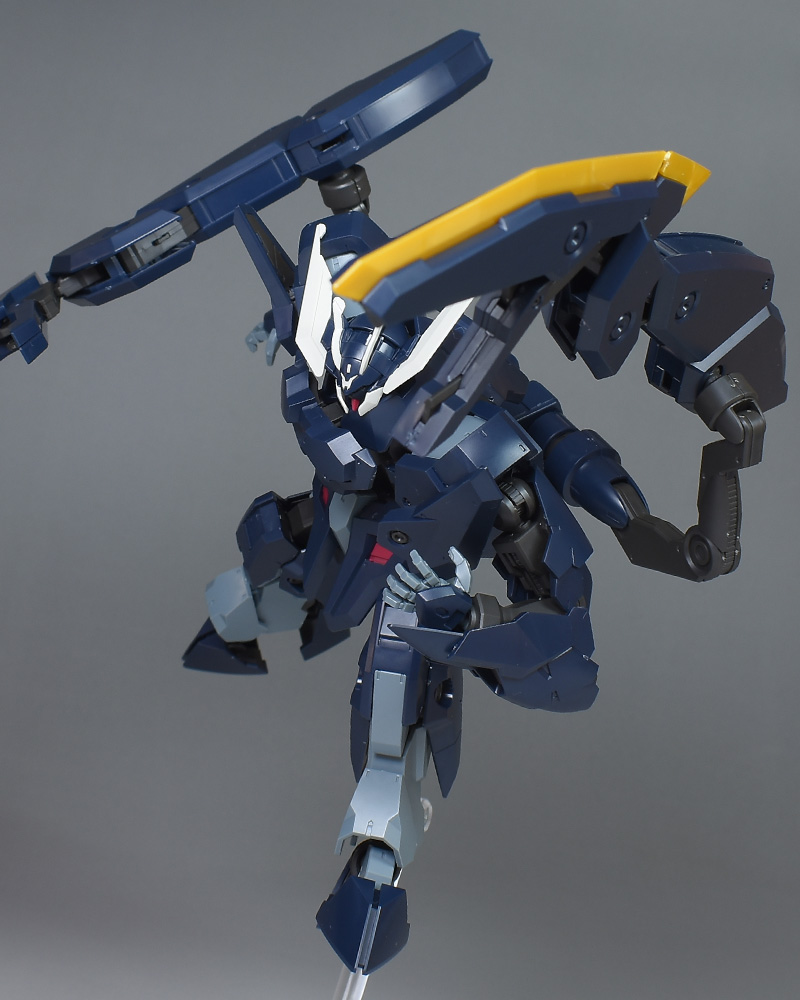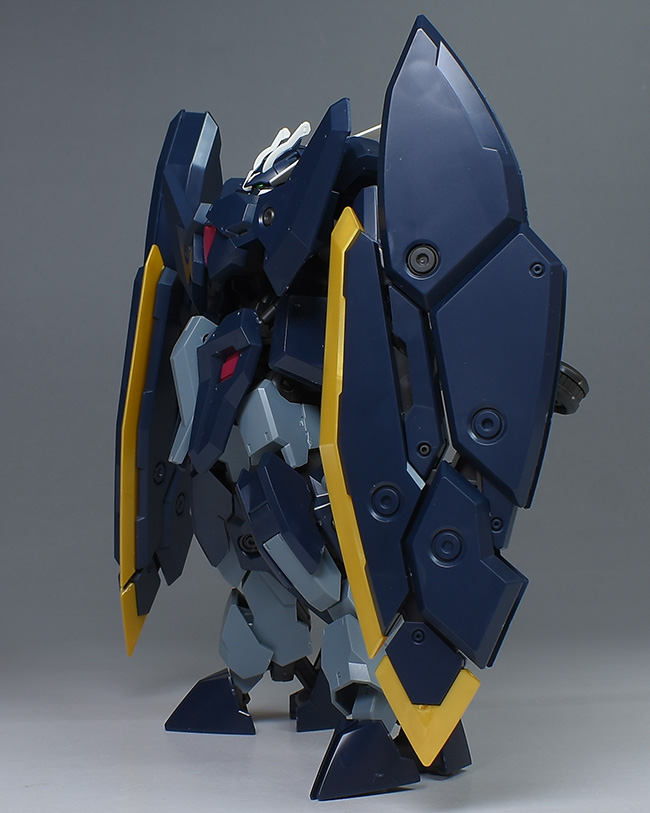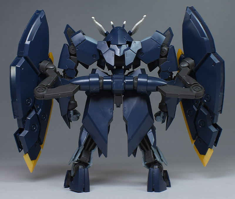 一部にHGガンダムバルバトス第6形態HG端白星などに使われているガンダム・フレーム4を流用しつつ、左右に大型装備「シールドプライヤーユニット」を持つ重厚な機体形状が新規パーツを用いて再現されています。