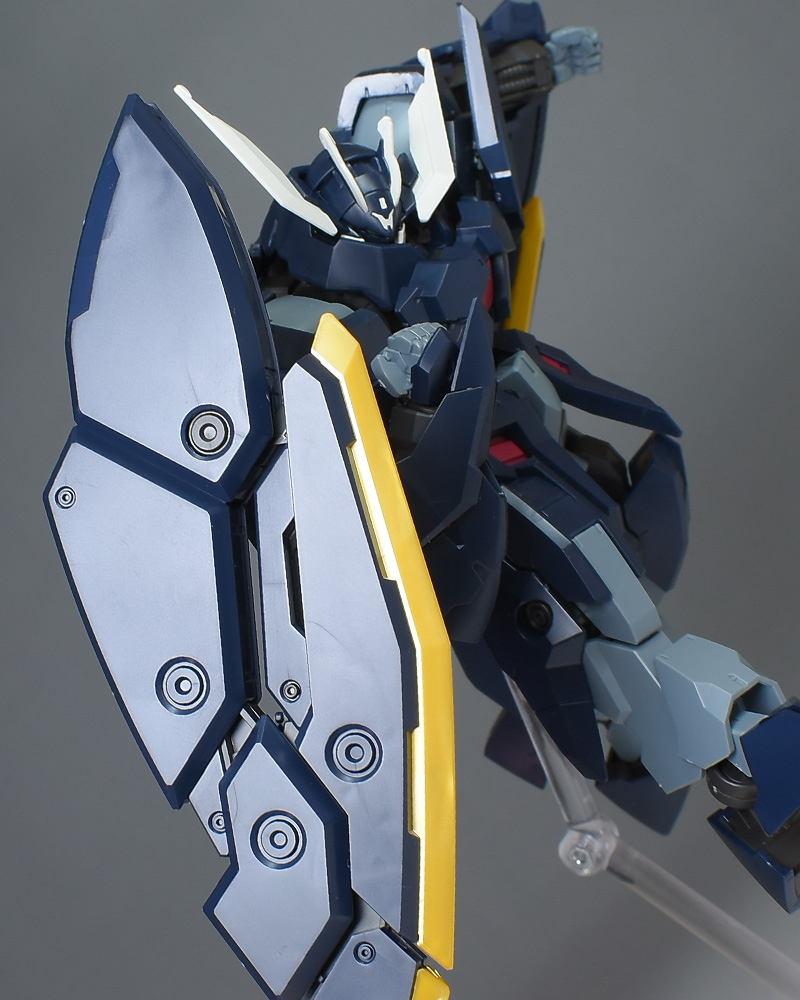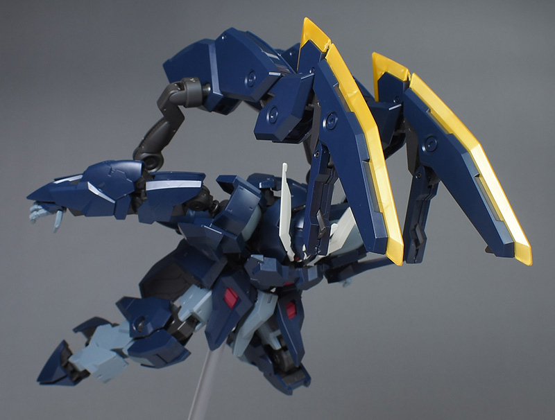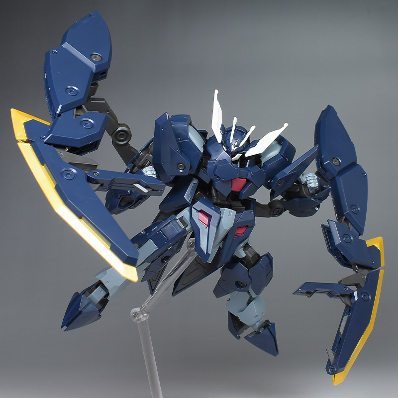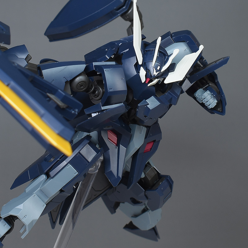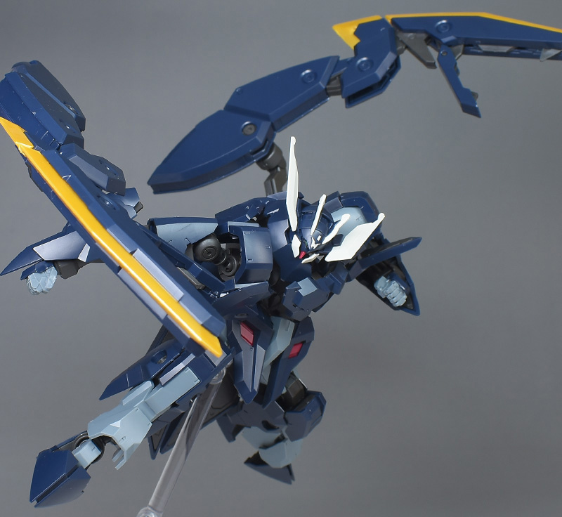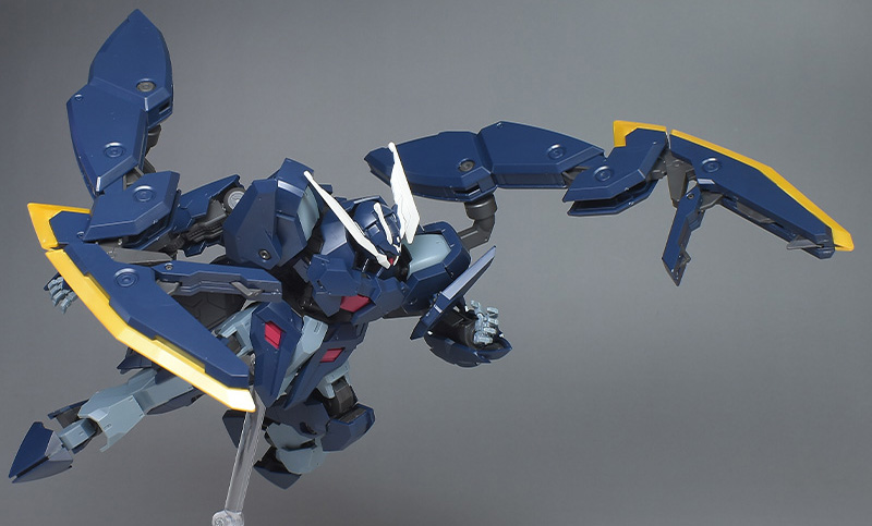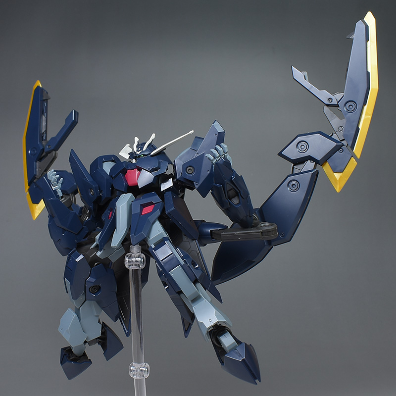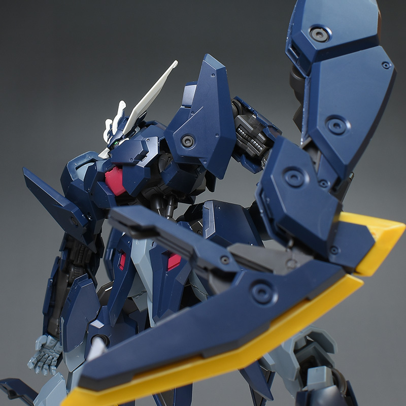 一部にHGガンダムバルバトス第6形態HG端白星などに使われているガンダム・フレーム4を流用しつつ、左右に大型装備「シールドプライヤーユニット」を持つ重厚な機体形状が新規パーツを用いて再現されています。