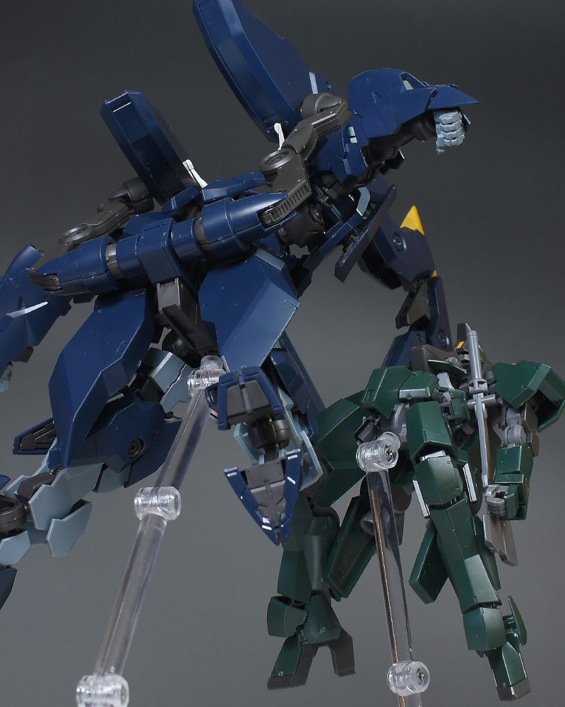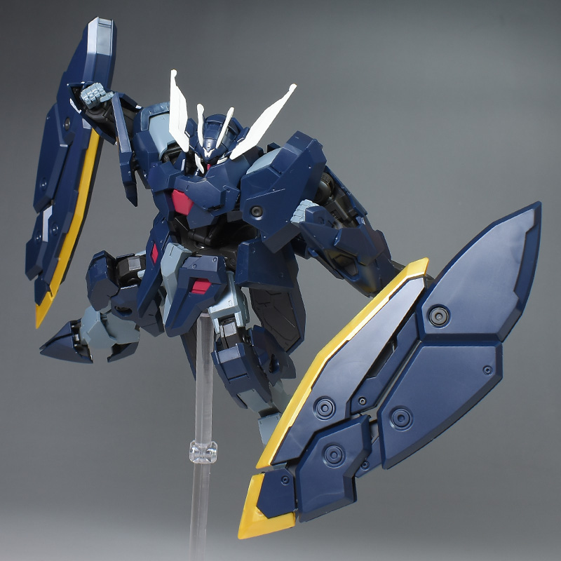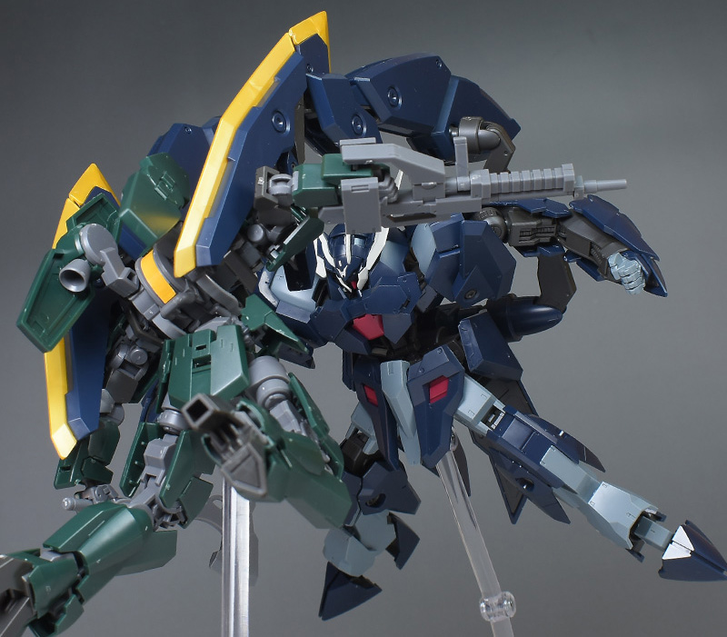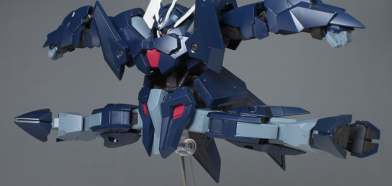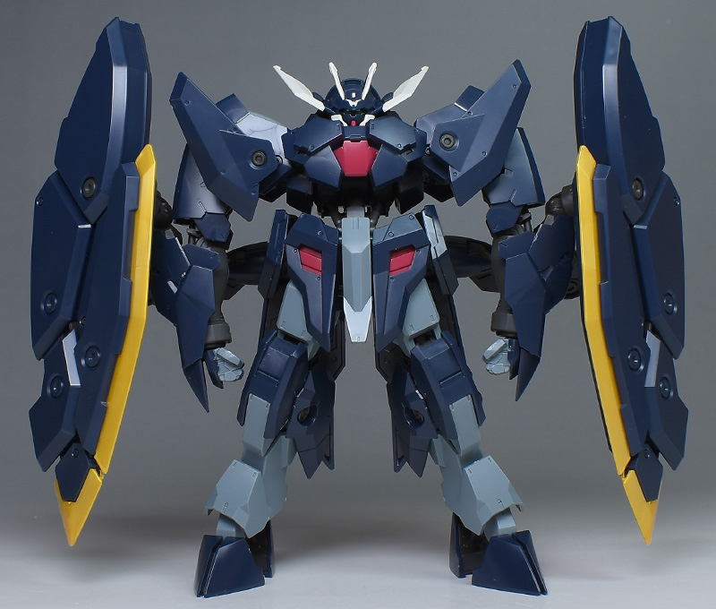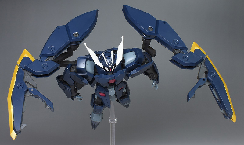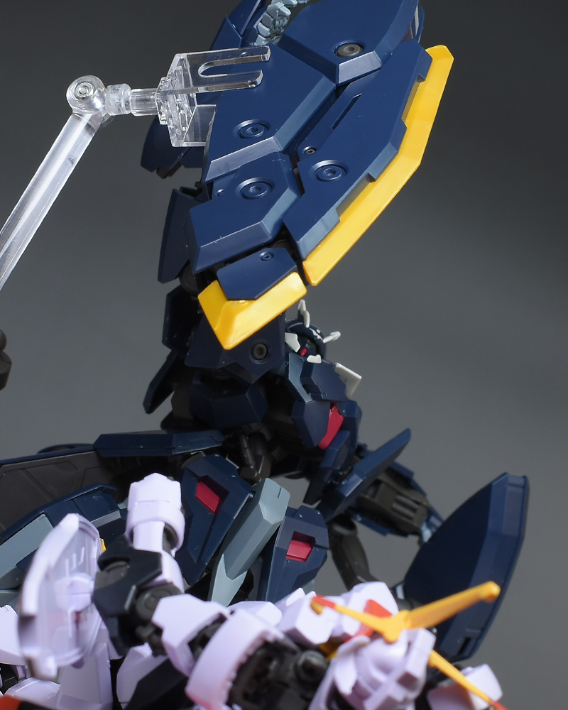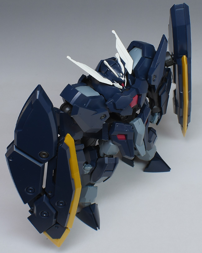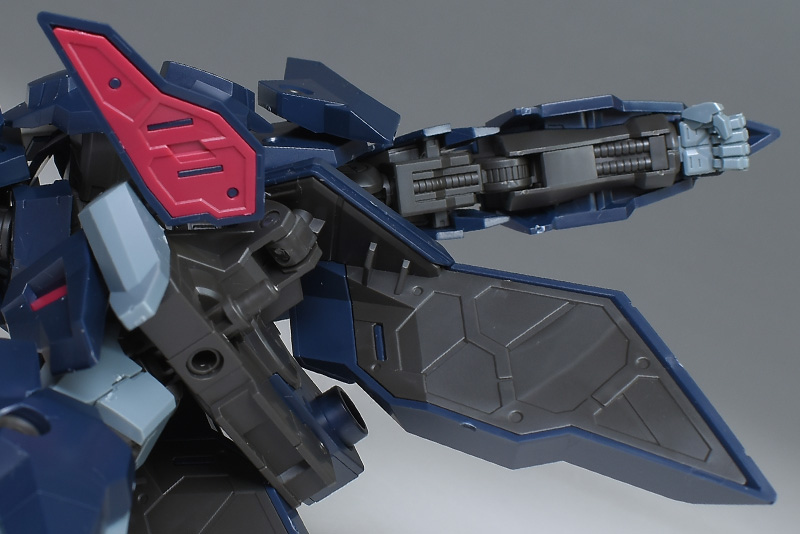 一部にHGガンダムバルバトス第6形態HG端白星などに使われているガンダム・フレーム4を流用しつつ、左右に大型装備「シールドプライヤーユニット」を持つ重厚な機体形状が新規パーツを用いて再現されています。