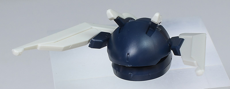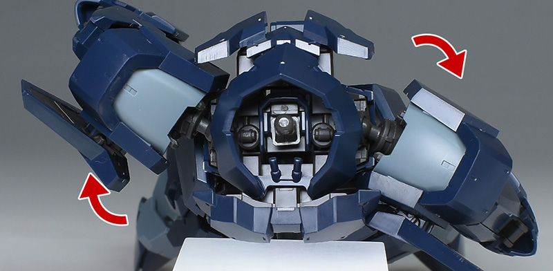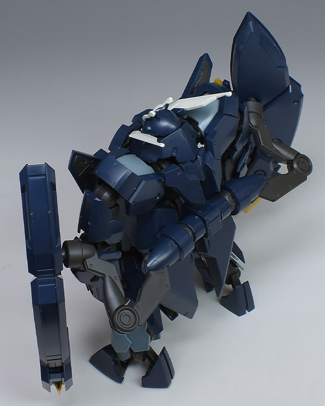 背部はコンパクトなバックパックと装甲のみ。ただし腰背部には左右シールドプライヤーユニットと連結するための筒型のジョイントアームが造形されています。
