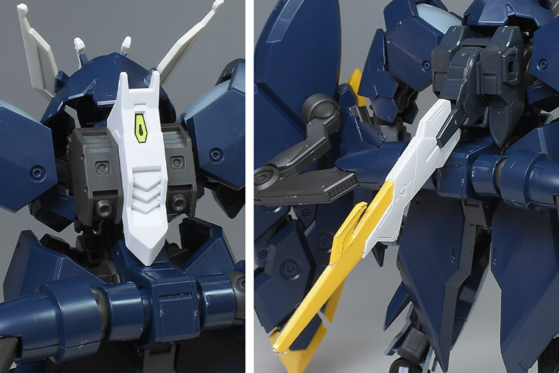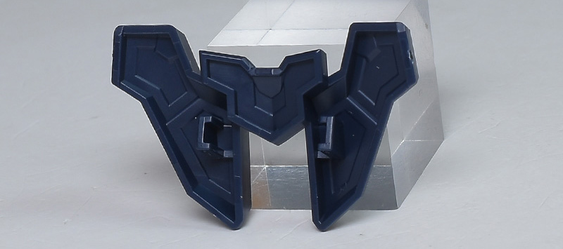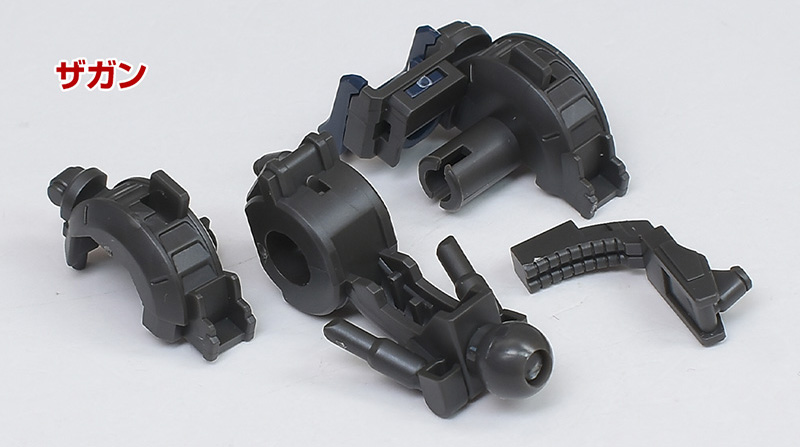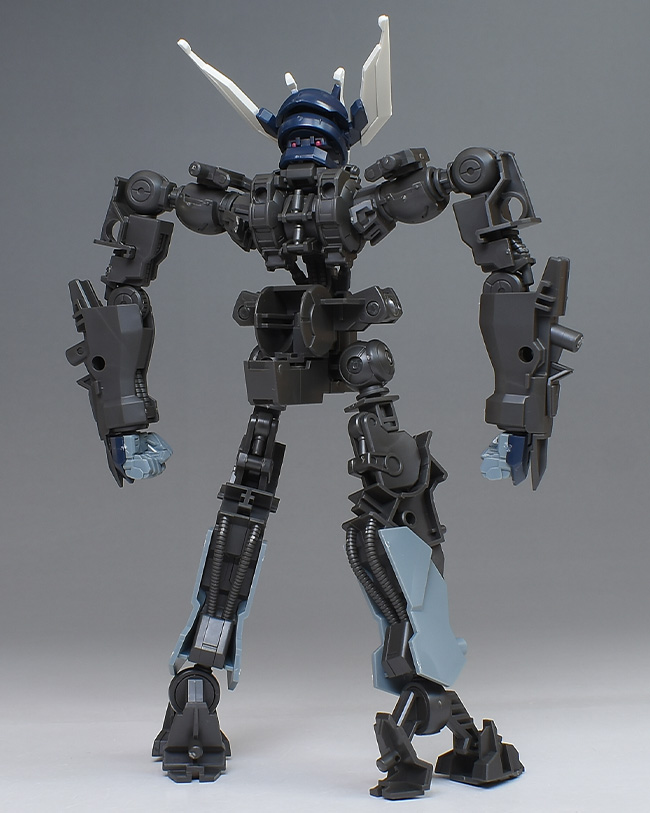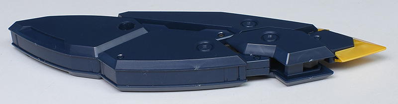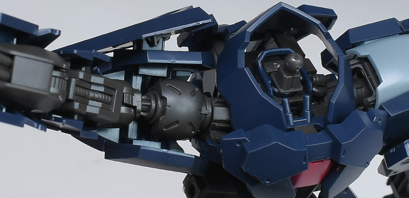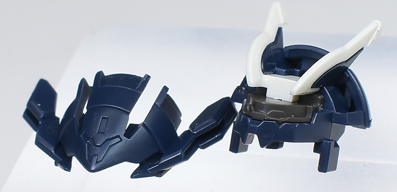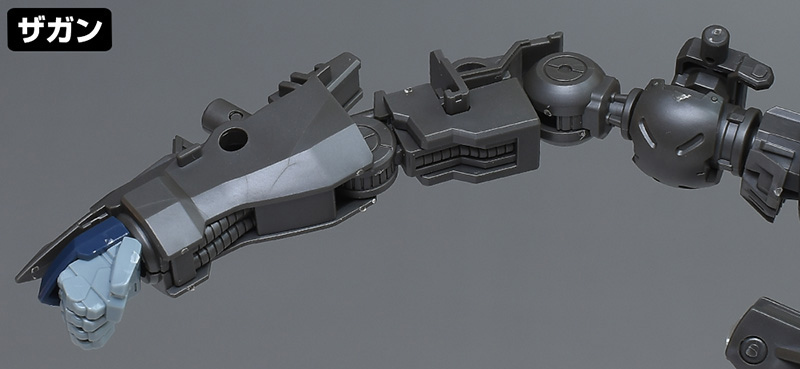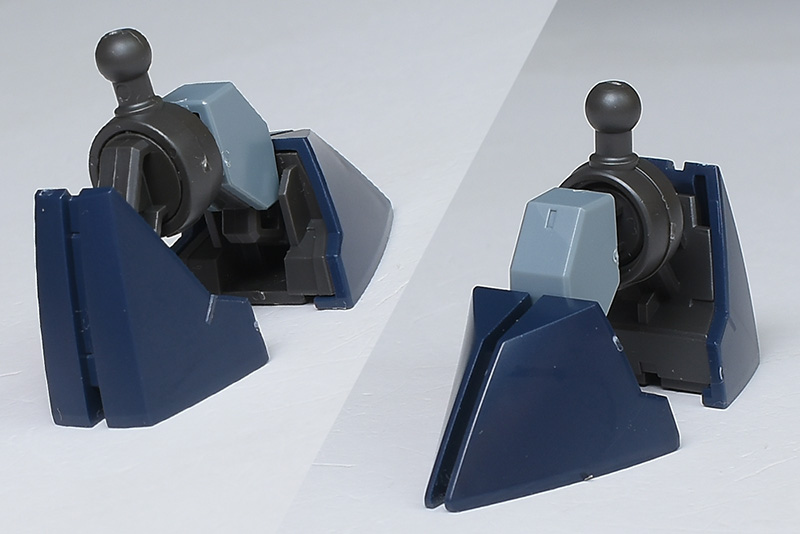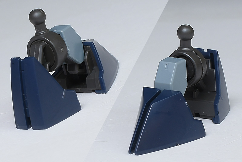 成形色はダークブルーを基調に、腰部や肩部、脚部などにライトグレー、胸部や腰部にレッドを配色。その他、頭部のアンテナ類がホワイト、シールドプライヤーユニットの先端部希少金属部分がイエロー、内部や関節、シールドプライヤーユニットのアームなどがダークブラウン成形色での再現となっています。