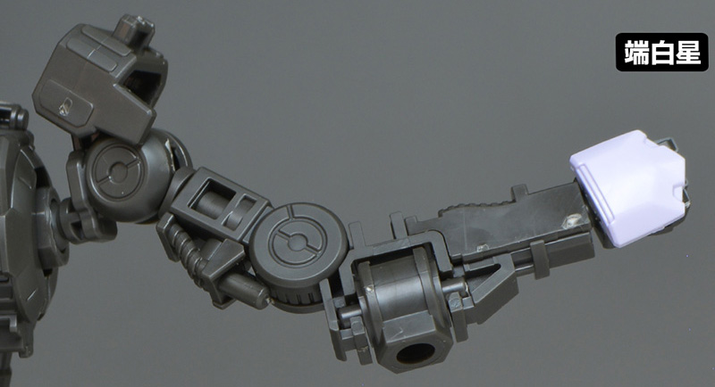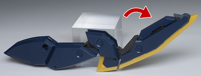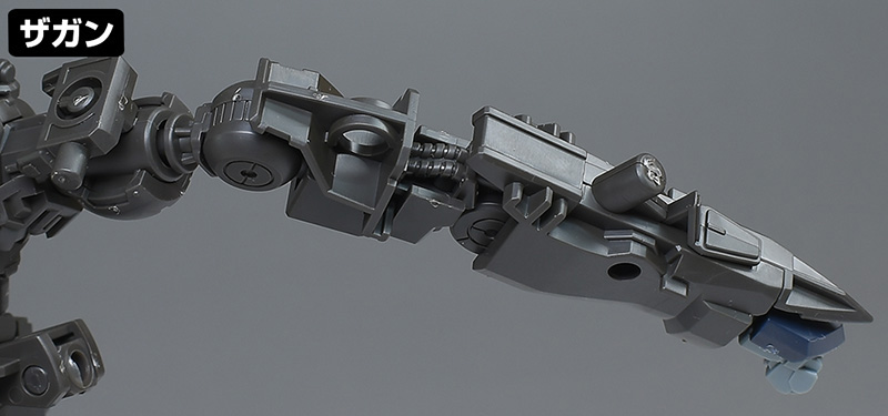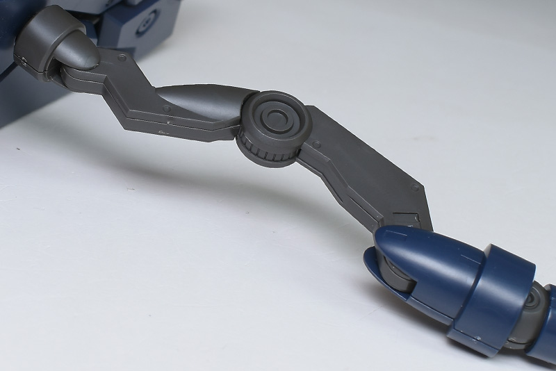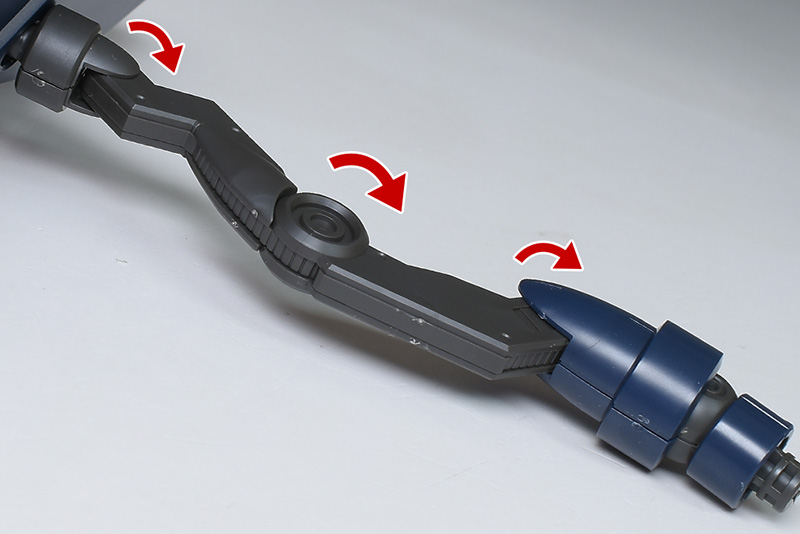 アーム本体も各部が上下に幅広く可動するようになっています。ロールは基部とシールドプライヤーユニットの接続部のみ。ですが、アームの各部可動ギミックによってシールドプライヤーユニットを幅広く可動させることができます。各部とも左右の組み合わせですが合わせ目は段落ちなどでモールド化。