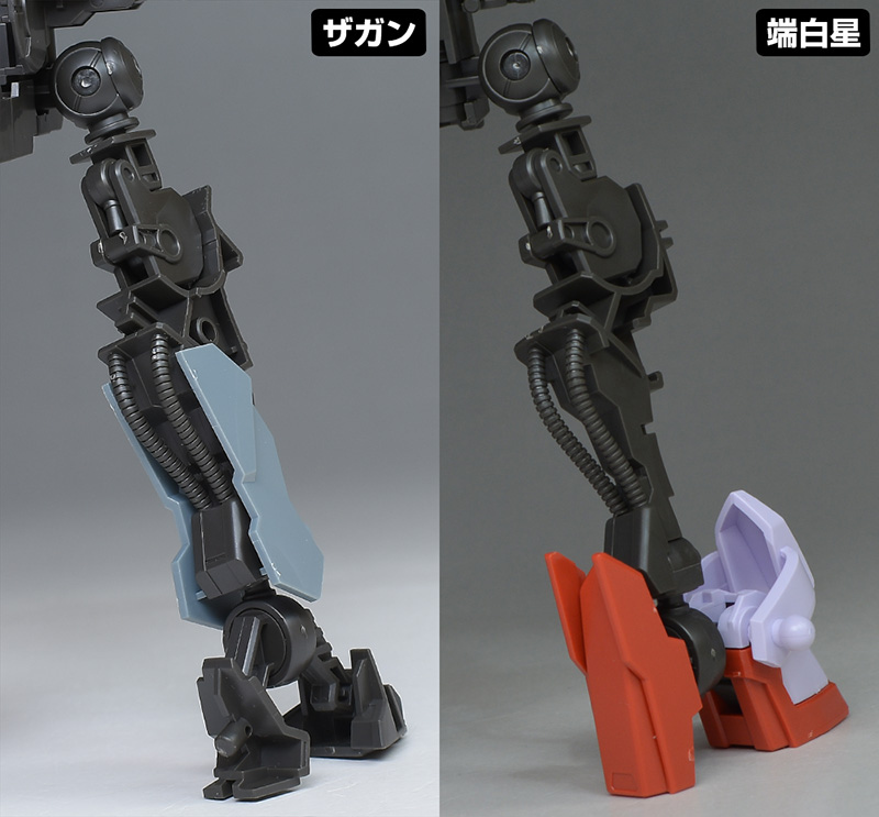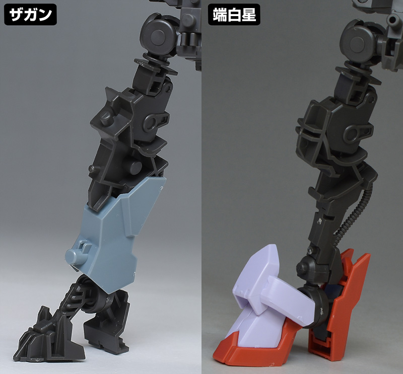 脚部内部フレームをを端白星と比較して。膝から上は流用パーツで構成されていますが、膝から下はザガン用に肉厚なフレームが新造されています。(足首を除く)スネの外装パーツを組み付けないと足首のポリキャップが固定できない仕様。