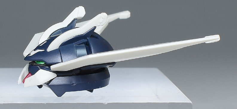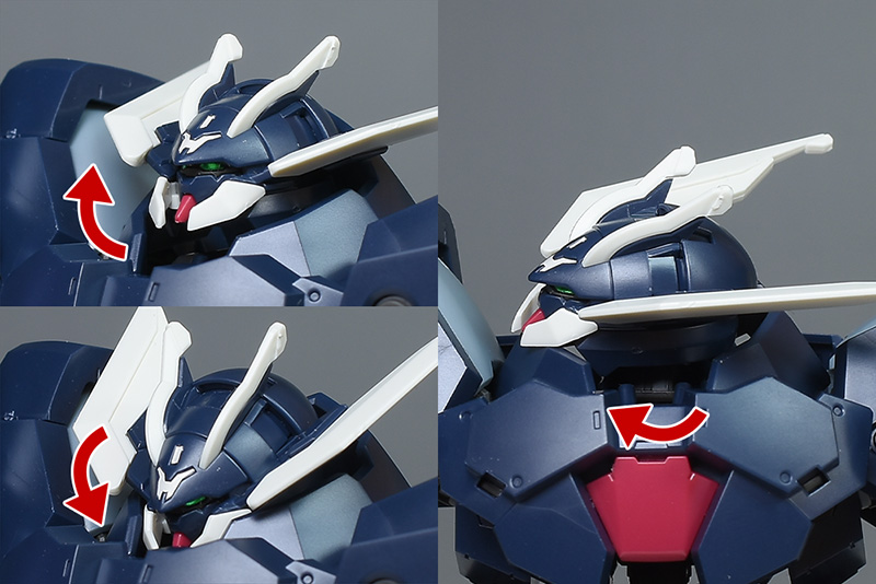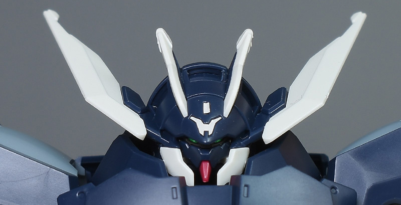 頭部。フェイスはガンダムタイプらしいデザインながら、額や左右、頬周りには白いアンテナや爪のような装甲が造形。幅が広くワイルドな頭部形状になっています。首周りも厚みのある襟装甲で覆われていて重厚。