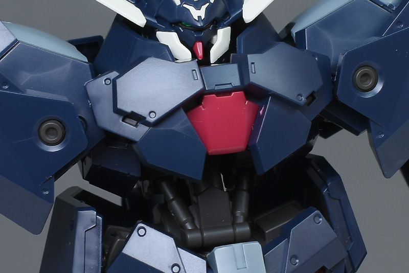 胸部・腹部。エッジの効いた装甲が多数折り重なる形で造形。メカニカルさと重厚感を併せ持つデザインになっています。中央の赤い装甲はパーツできっちりと色分けされています。赤い装甲にはイシュー家の家紋シールを貼るようになっていますが今回は貼っていません。