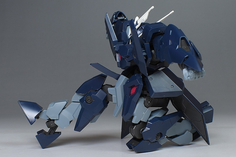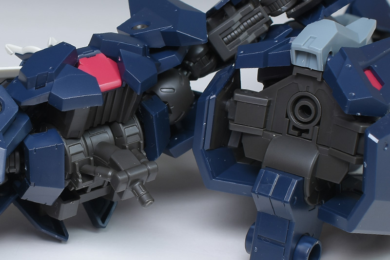 腹部は他のガンダムフレーム採用機と同様、フレームが剥き出しの状態。大型機体なだけに相当な負荷がかかってそうですが、可動の柔軟さも感じさせるデザインになっています。部分的にゴールドやシルバーで塗り分けても雰囲気が出て良さそう。