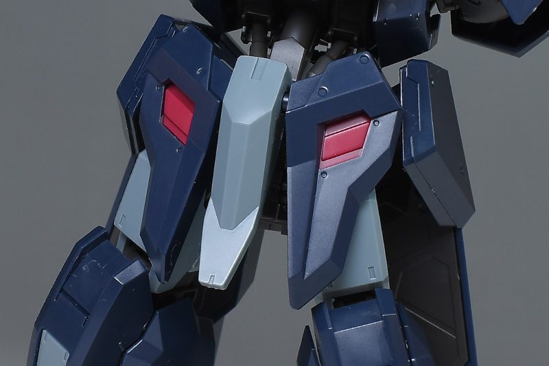 大腿部は前後、膝から下は多数のパーツを組み合わせる構造で、合わせ目は各部とも段落ちなどでモールド化。側面のハードポイントらしき丸モールドはパーツできっちりと色分けされています。脚部外装まで裏打ちパーツがきっちりと造形。