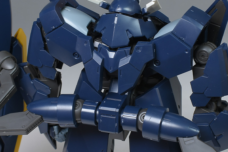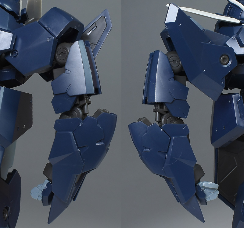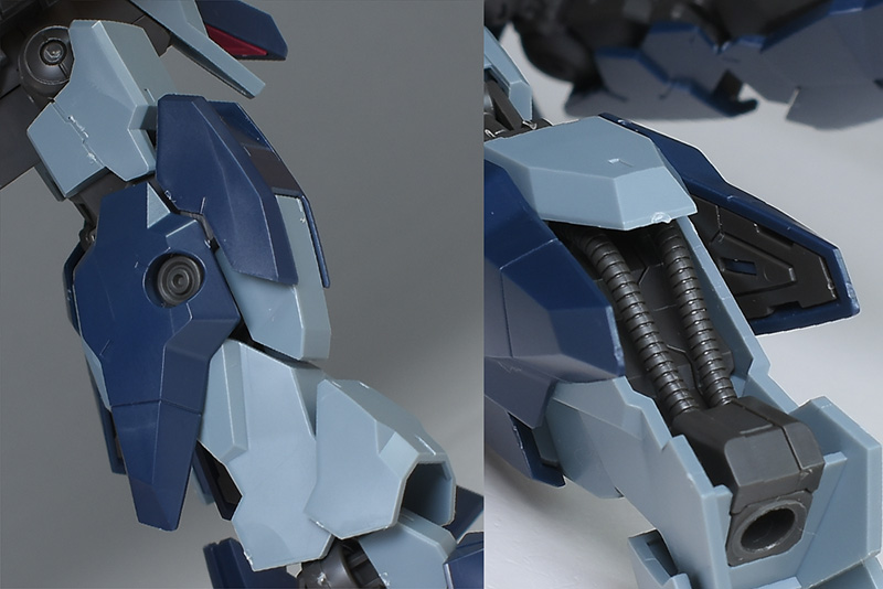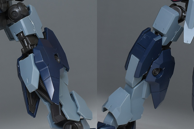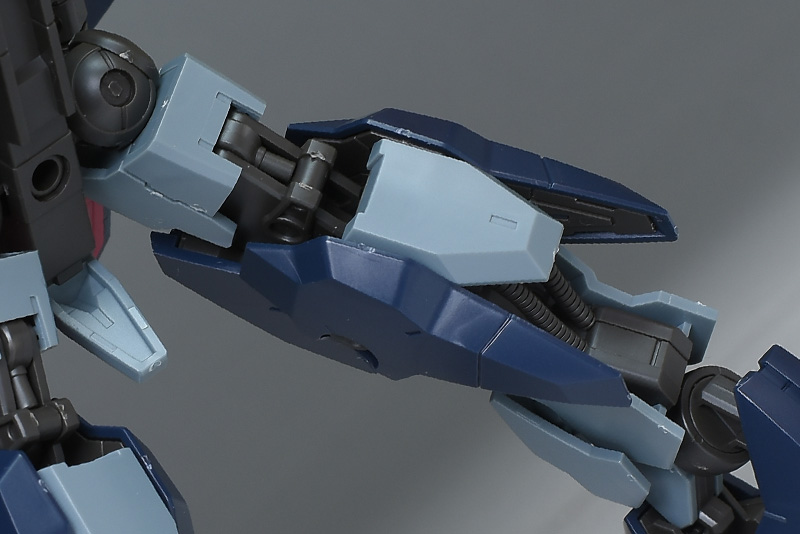 腕部は程よい肉付きのフレームに装甲を被せたような構造。エッジの効いた装甲が組み合わさることで、強度とマッシブさを感じさせるシルエットになっています。モールドもきめ細かく荒い雰囲気。前腕の一部装甲はパーツできっちりと色分けされています。