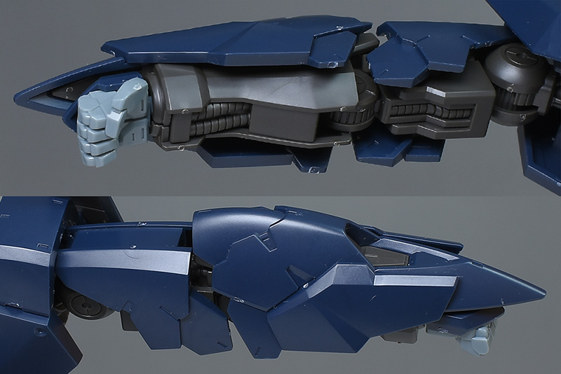 上腕、前腕共に多数パーツを組み合わせる構造で合わせ目はモールド化。ハンドパーツは穴無しのものが付属し、指造形もよく見栄えのする仕上がりになっています。手甲裏が見えるのが少しだけもったいないかも。外装の先端部分は尖った装甲で打突に優れた仕様。