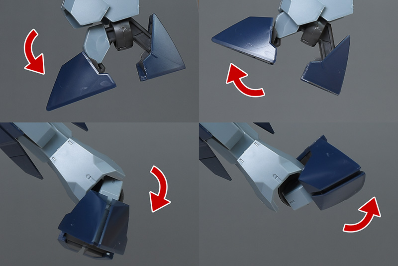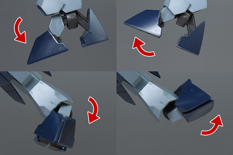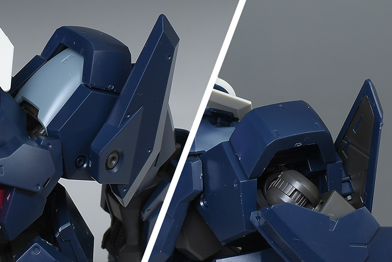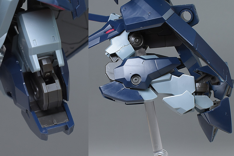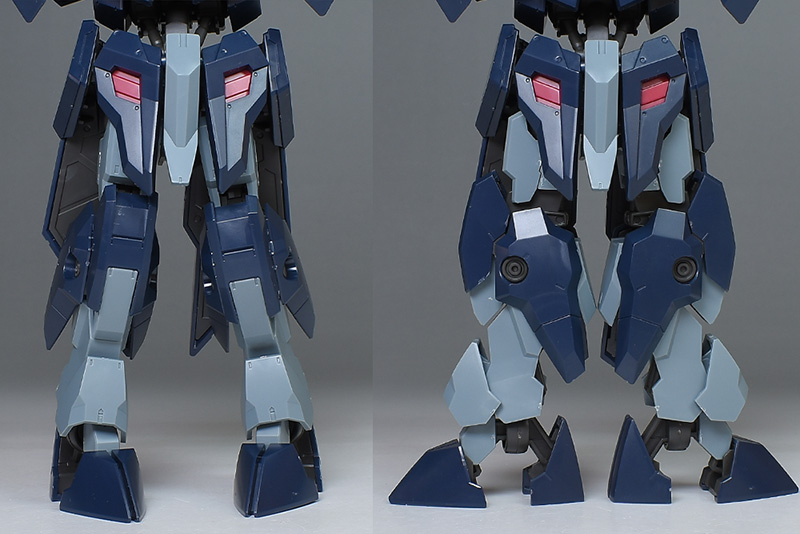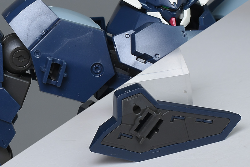 腰アーマー裏は前後ともモールドが入った裏打ちパーツで蓋がされています。HGには珍しく造りが良いですし、塗り分けるともっと良くなりそうですね。リアアーマーは側面にマウントされていて上下や左右など柔軟に可動。