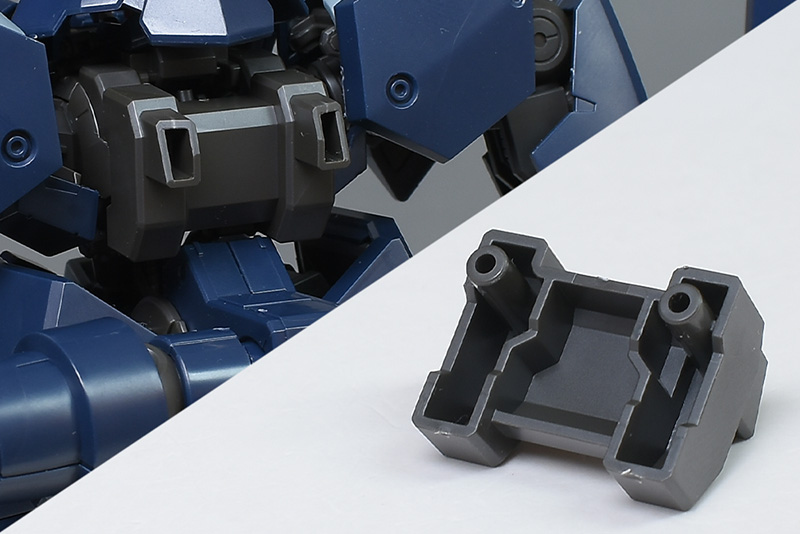 バックパックは他のHG鉄血のオルフェンズシリーズと同幅の2ダボ接続。なので他のキットと交換することができます。ただし腰背部のユニットが干渉するため、物によっては組み合わせが制限されます。