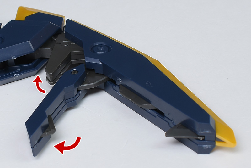 先端部分はクロー状で内側のクローを展開することができます。クロー内側は牙のようなトゲモールドが造形。掴み強度と破壊力の高さを感じさせる造りになっています。別パーツ化されているので塗り分けもラク。