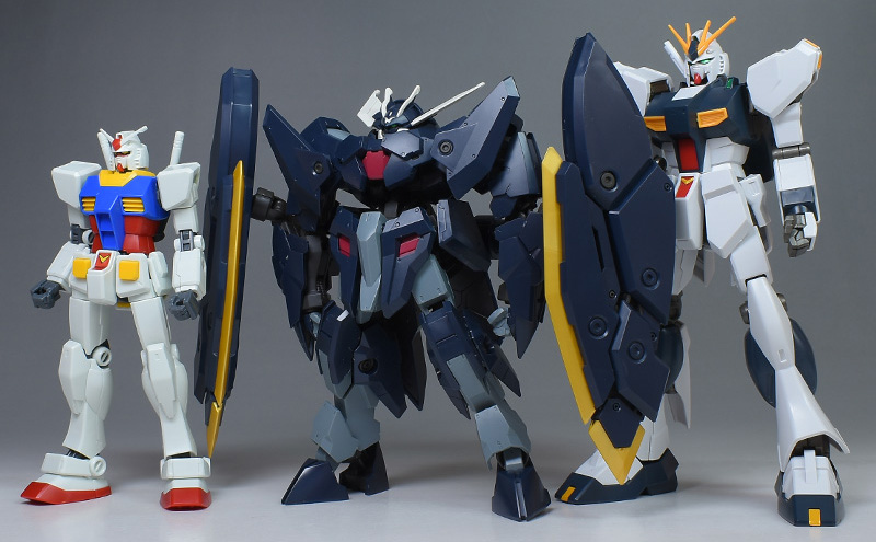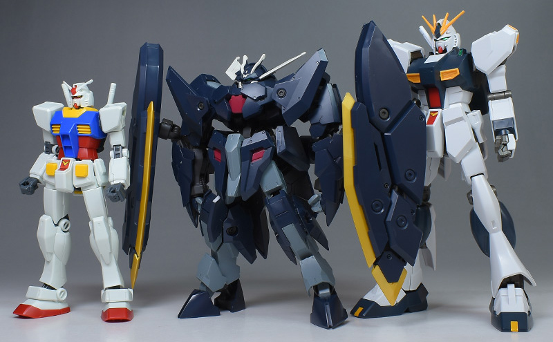 HGUC RX-78-2ガンダム(リバイブ版)、HGUCνガンダム(ファンネルなし)と並べて大きさを確認。特別全高が高いわけではないですが、外装にボリュームがあってシールドプライヤーユニットも装備しているため、横幅と厚みがあります。