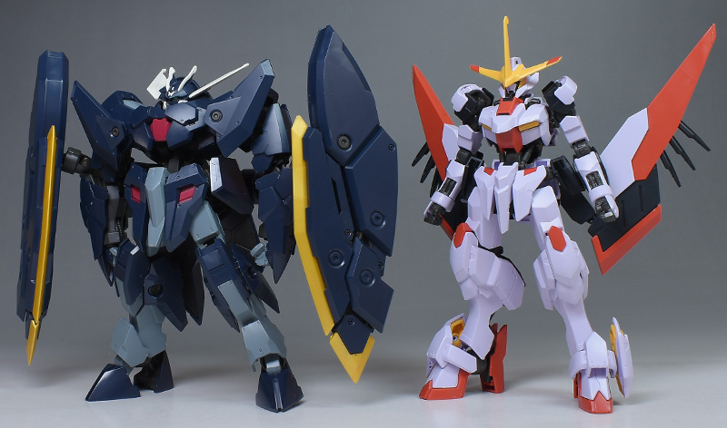 劇中で戦闘を繰り広げたHGガンダム端白星 第2形態と並べて比較。端白星に比べてカラーリング的にもデザイン的にもヒール感が強いですし、大型なのでラスボス感も強いですね。