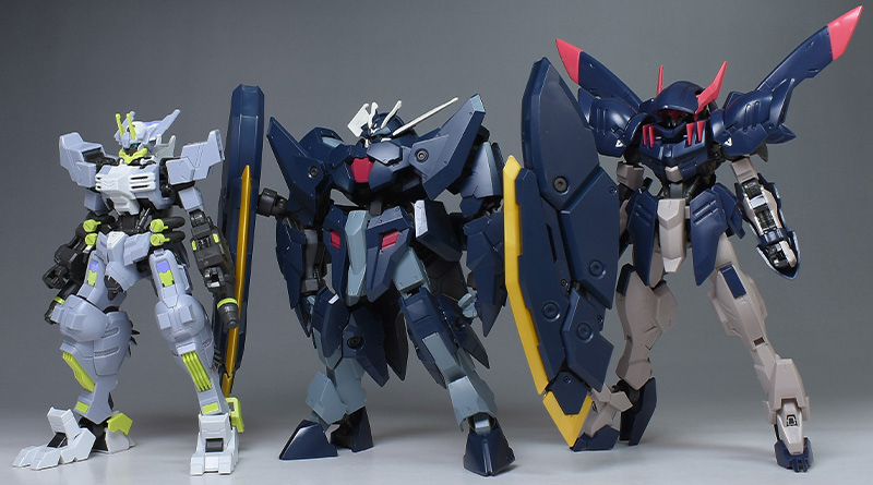 その他のガンダム・フレーム採用機であるHGガンダムアスモデウスHGガンダムグレモリーとも並べて。ザガンはガンダム・フレーム採用機の中でも特にマッシブ感が強く、大型で重厚な機体形状になっています。