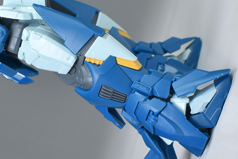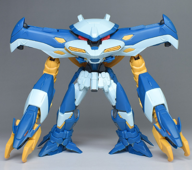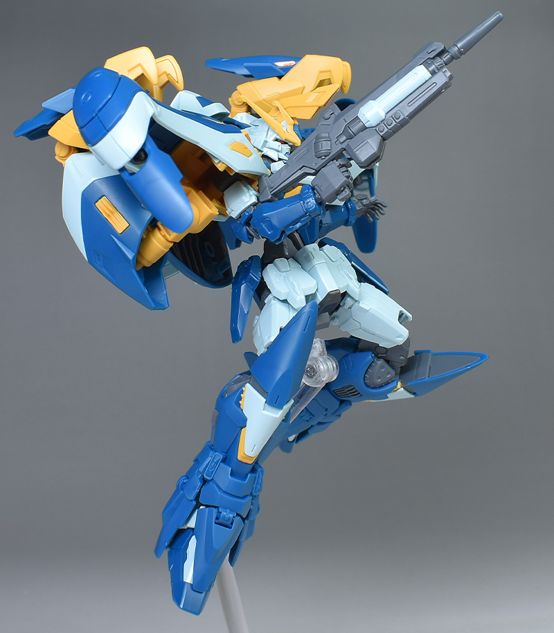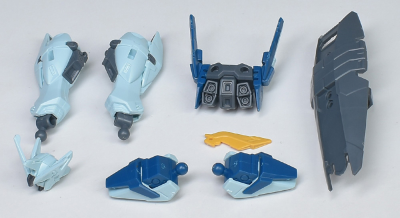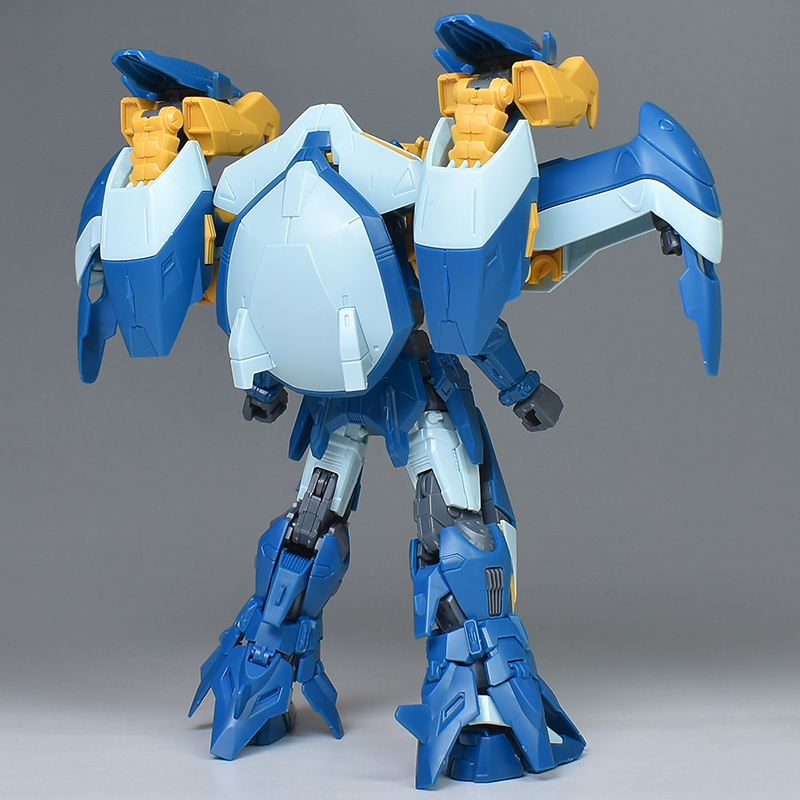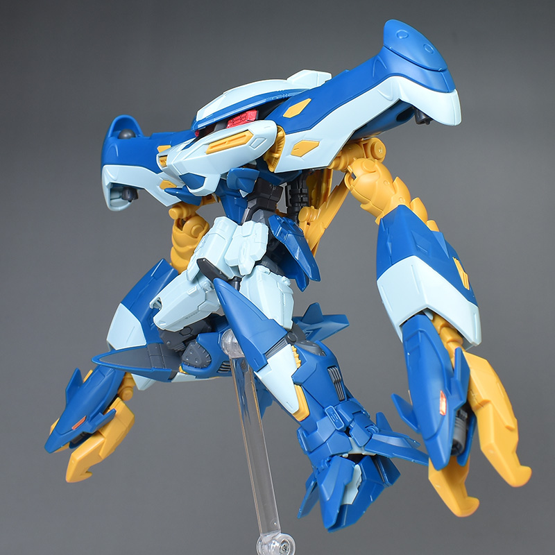 成形色はブルーグリーンとややくすみのあるイエローを基調に、各部にライトブルーを配色。その他、内部や関節、武装類はグレー成型色での再現となっています。
