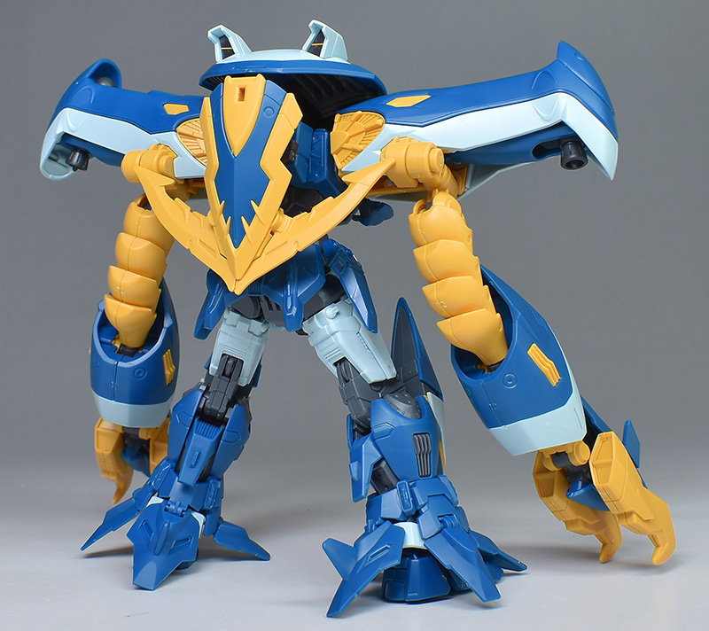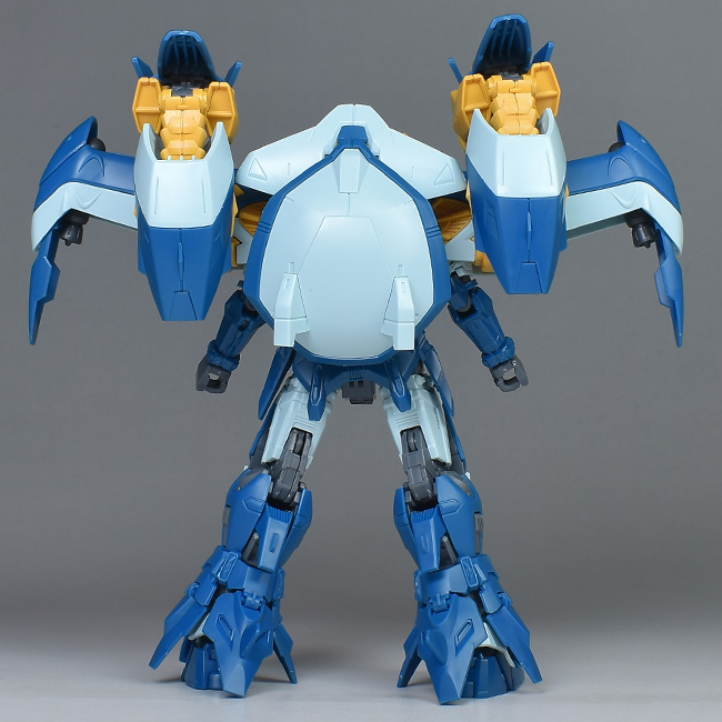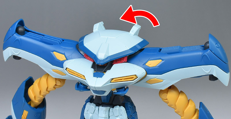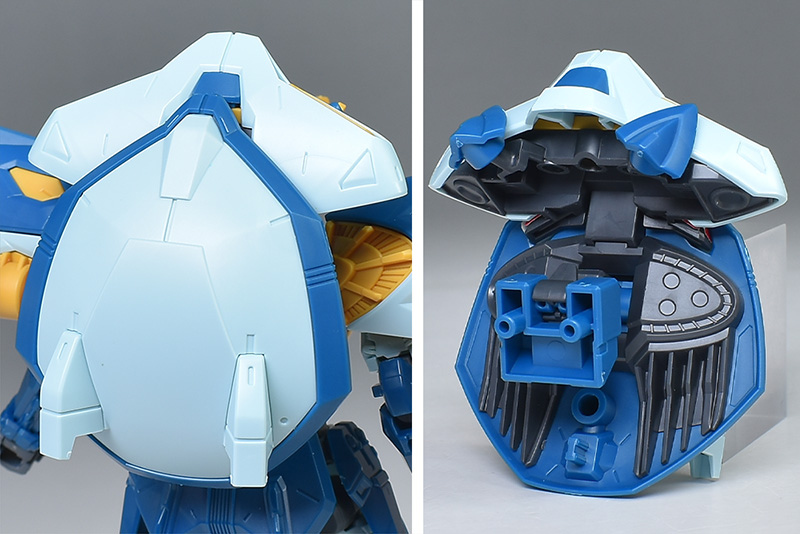 背部にはデュエルモード時に頭部を覆うためのセンサーユニットを装備。裏面は裏打ちパーツでメカニカルに造形されています。