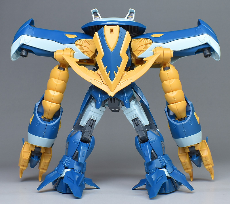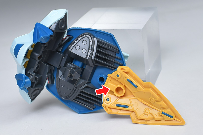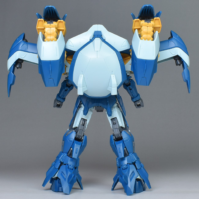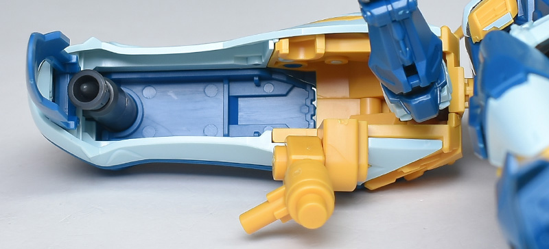 内部は広く空いており、デュエルモード時に腕部が収納できるようになっています。側面の青い装甲も収納できますし、ゴレムクロー用の黄色いジョイントも内側にロックすることができます。