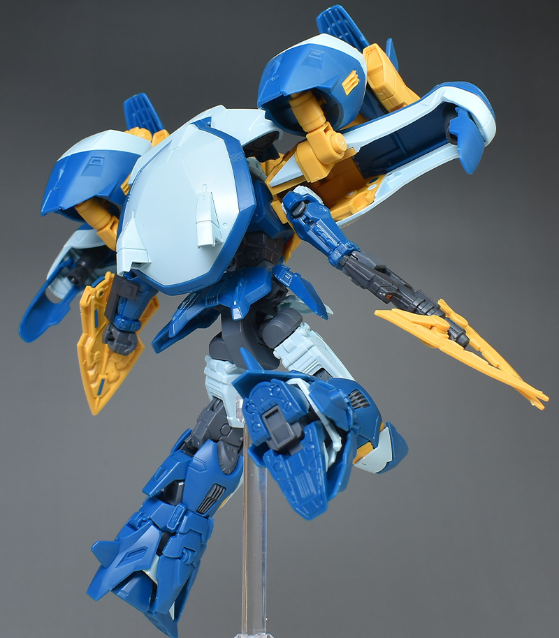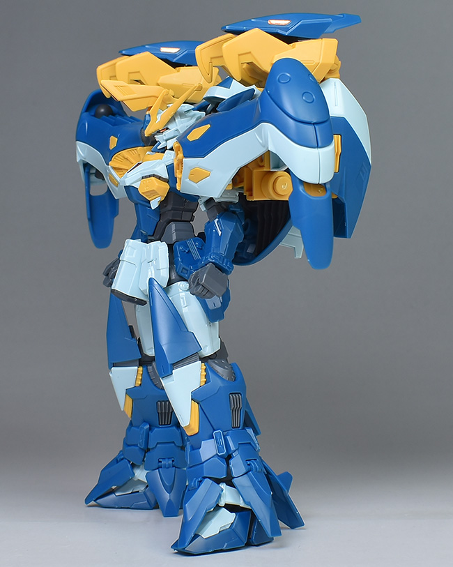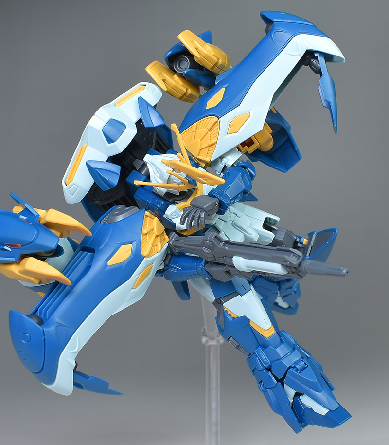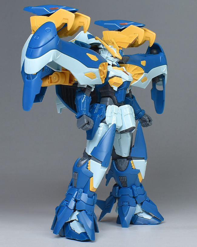 以上です。ヒロイックさ、ヒール感、生物感など、様々な印象を感じさせる面白いキットになっていますね。MS形態時はショルダーアーマーや両肩のゴレムクロー、脚部装甲などに独特の存在感があってポージングが映えますし、関節各部が柔軟なのでポーズも自然な形で格好良く決めることができます。一方のデュエルモードはハイゴックに似た容姿で親しみがありますし、MS形態にはない重厚感を味わうことができます。