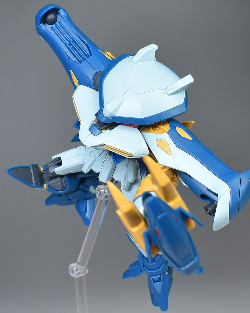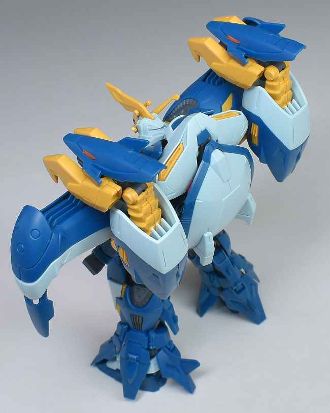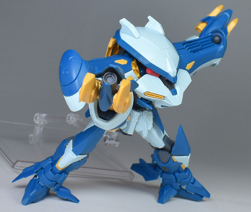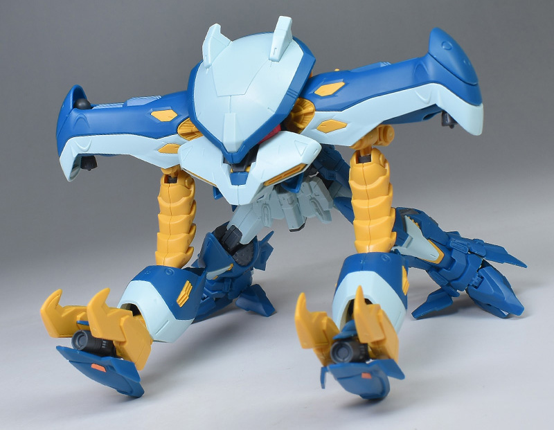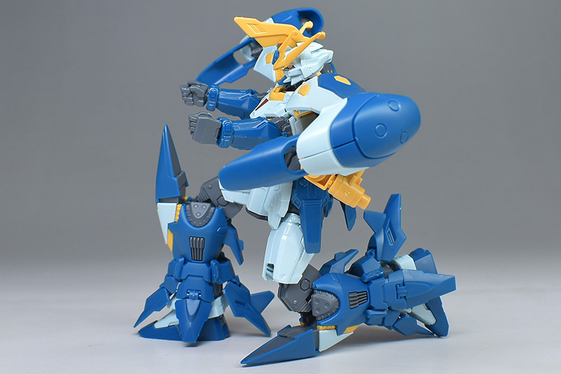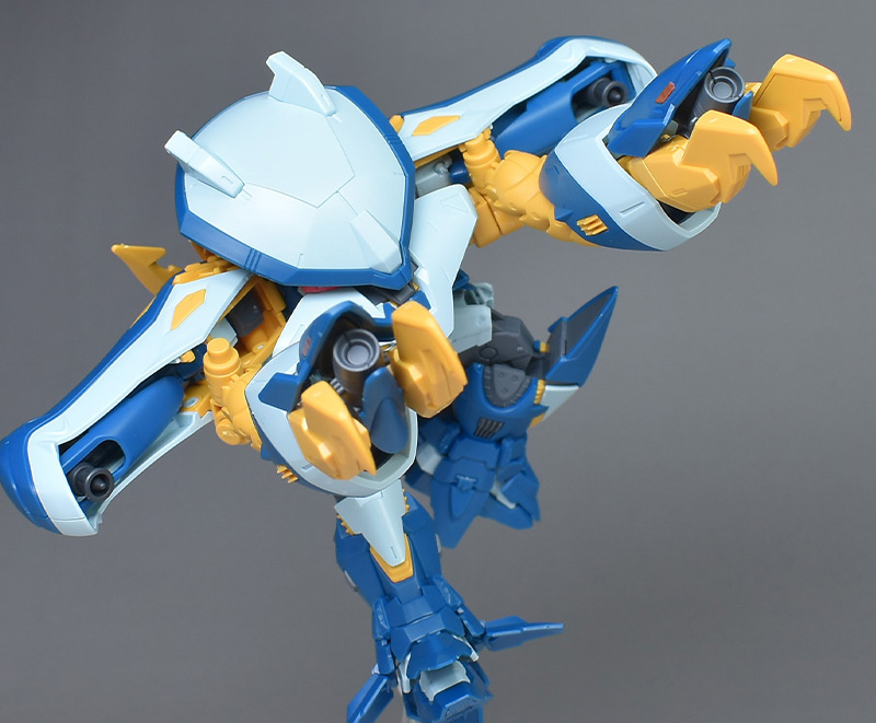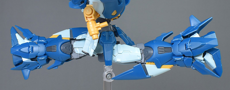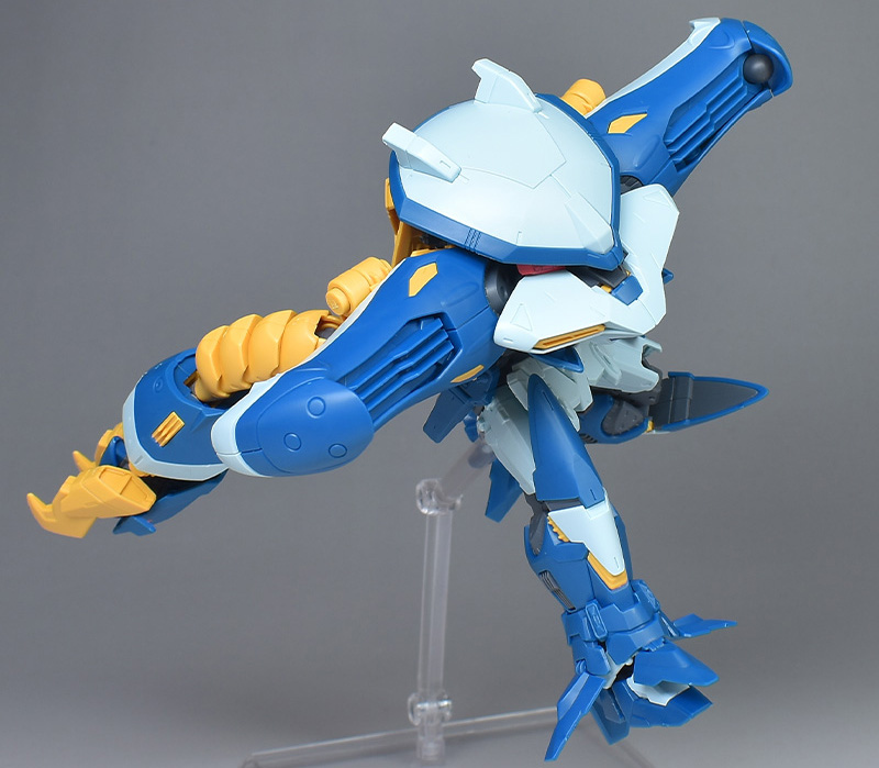 デュエルモード。両腕部に長いゴレムクローを装備。ハイゴックをモチーフにしたとされる、水中用MSのような特徴的な機体形状になっています。