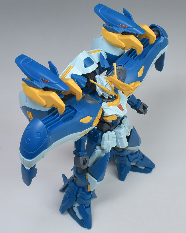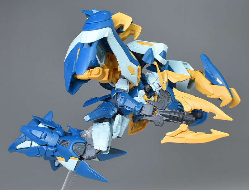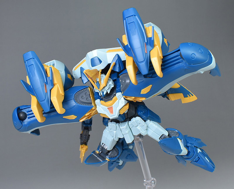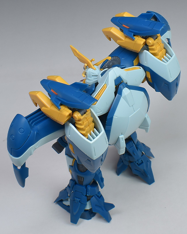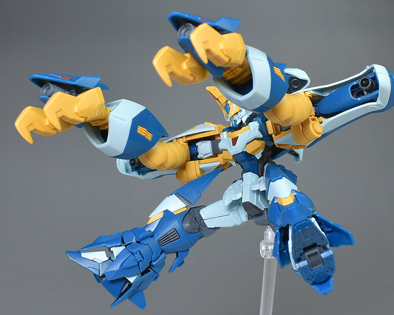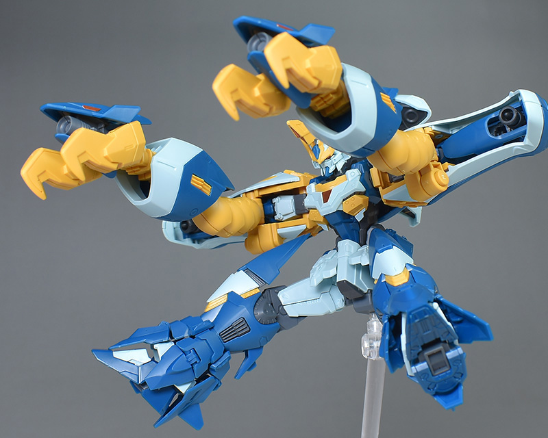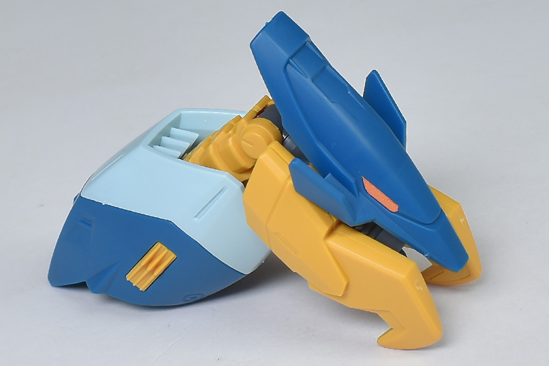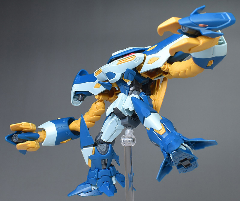 デュエルモード。両腕部に長いゴレムクローを装備。ハイゴックをモチーフにしたとされる、水中用MSのような特徴的な機体形状になっています。