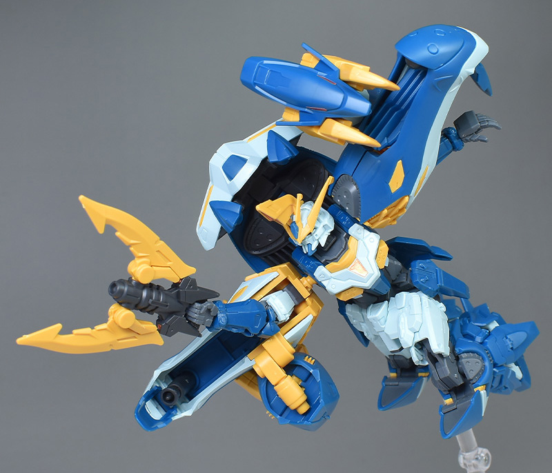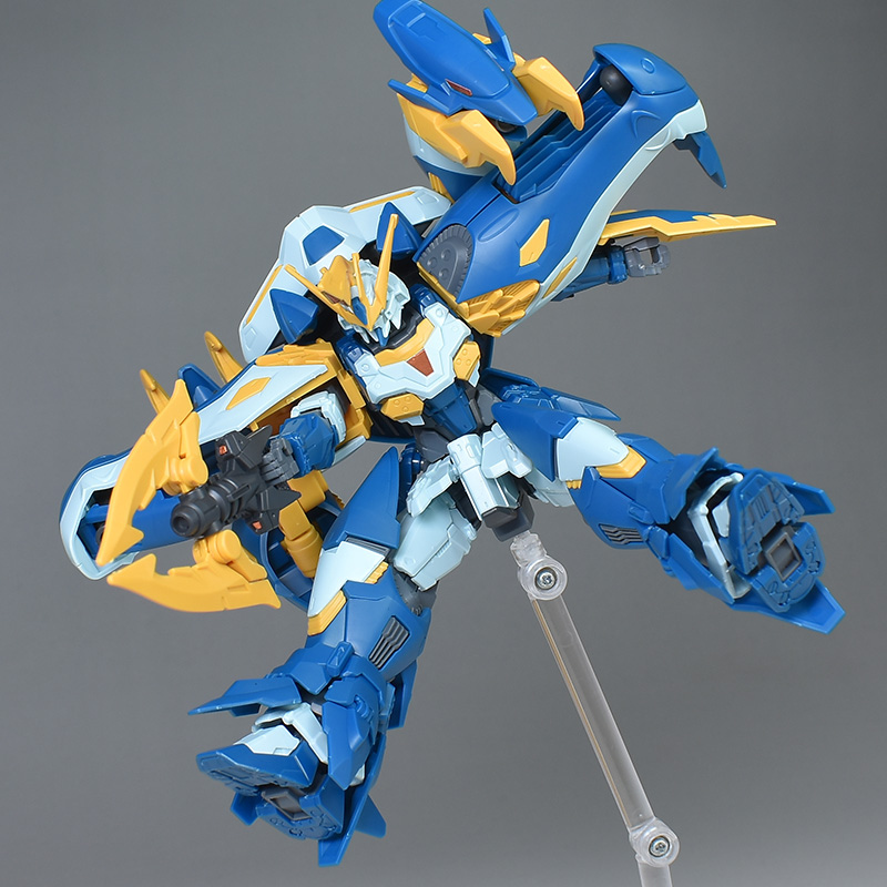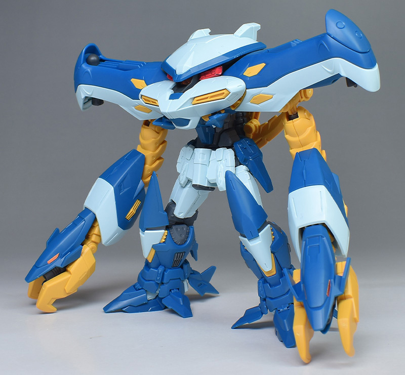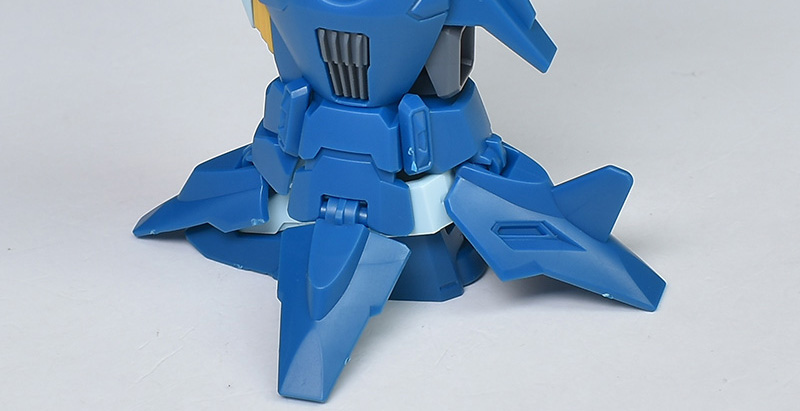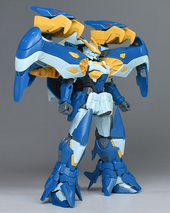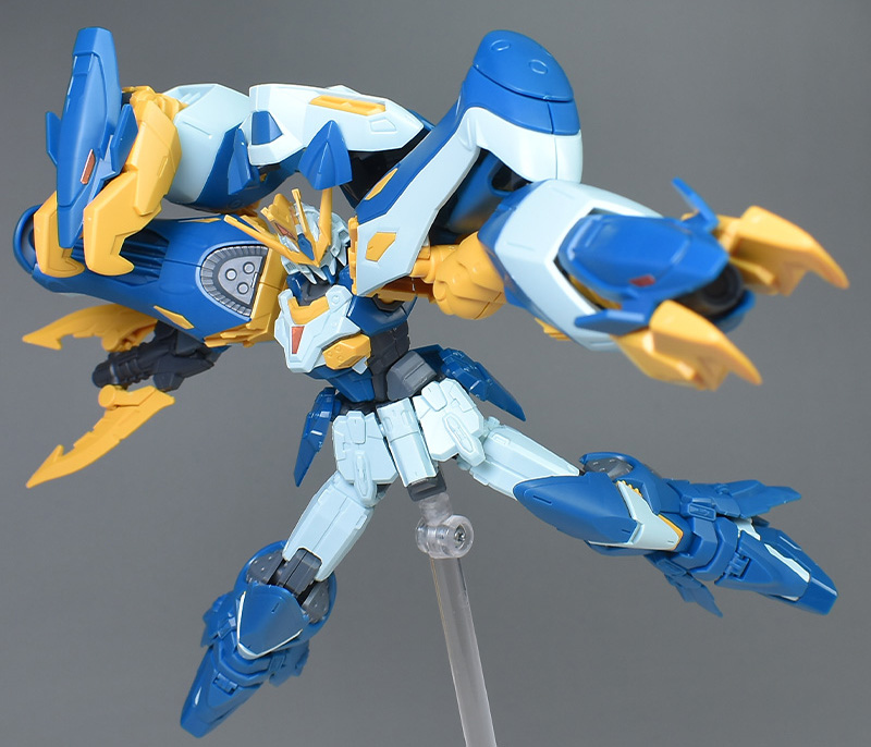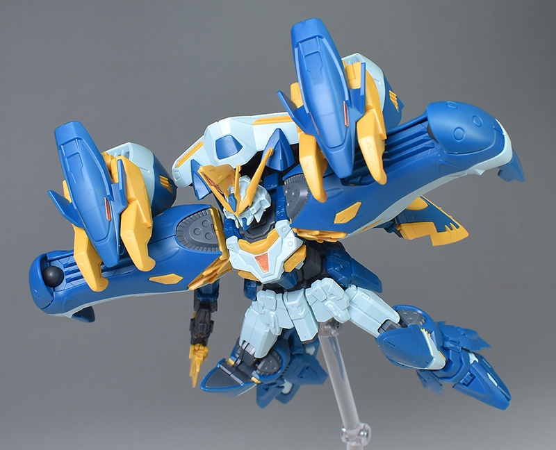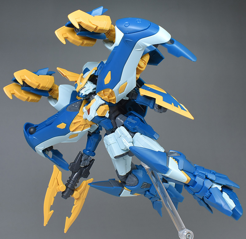 デュエルモード。両腕部に長いゴレムクローを装備。ハイゴックをモチーフにしたとされる、水中用MSのような特徴的な機体形状になっています。