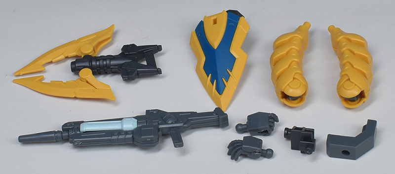 アサルト・ベイオネット、ビーム・ライフル、シールド、デュアルモード用の腕部パーツ✕2、武器持ち手(右)、平手(左)、シールド用ジョイントパーツ、ディスプレイ用ジョイントパーツが付属。