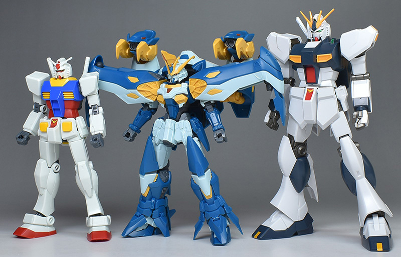 HGUC RX-78-2ガンダム(リバイブ版)、HGUCνガンダム(ファンネルなし)と並べて大きさを確認。HGACのキットなので全体的に小柄。ですがショルダーアーマーやゴレムクローなどによって横幅がHG2体部ほどになっています。バーンレプオスの全高は20.9m。
